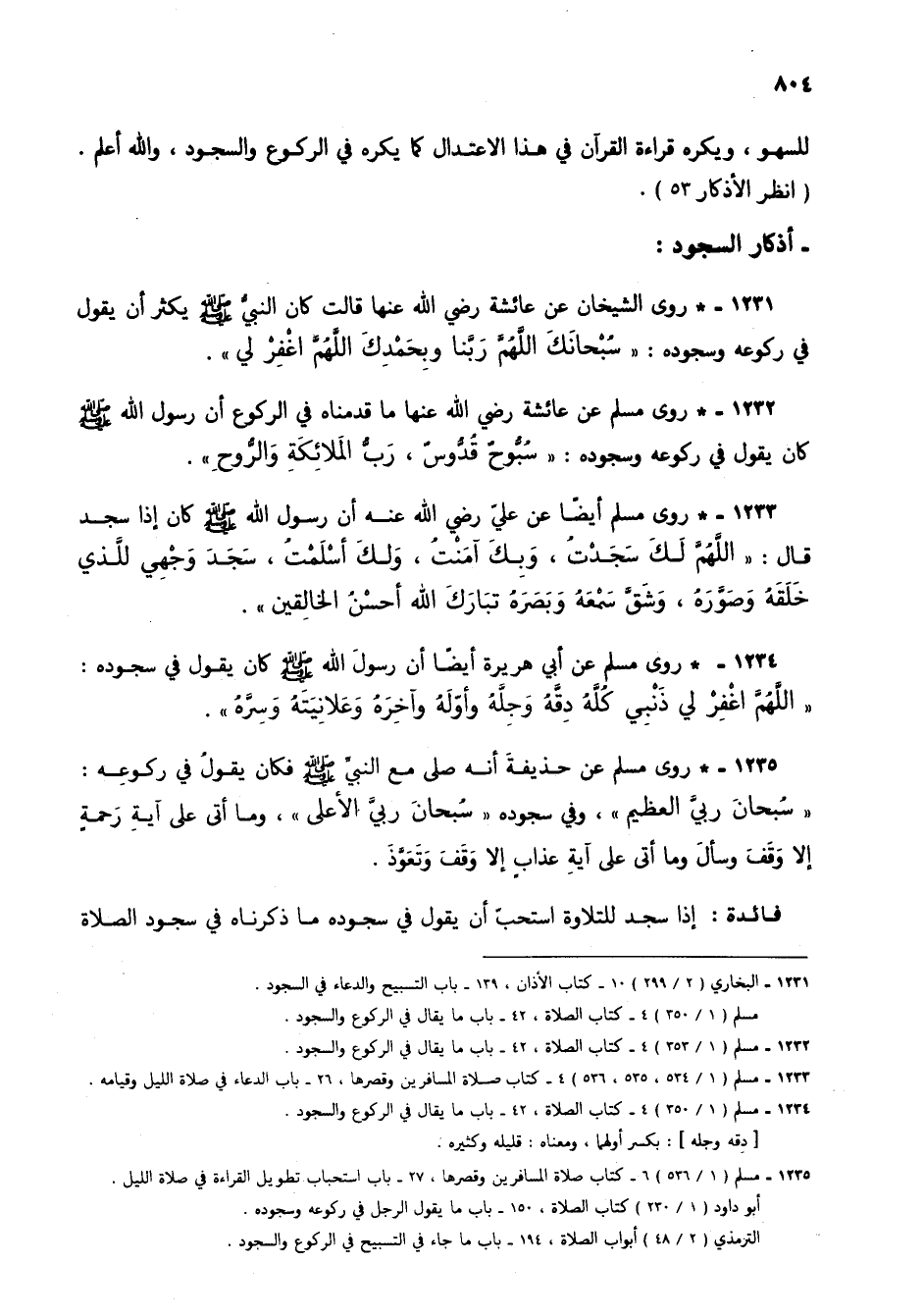 1232 - * روى مسلم عن عائشة رضي الله عنها ما قدمناه في الركوع أن رسول الله صلى الله عليه وسلم كان يقول في ركوعه وسجوده: "سبوح قدوس، رب الملائكة والروح".