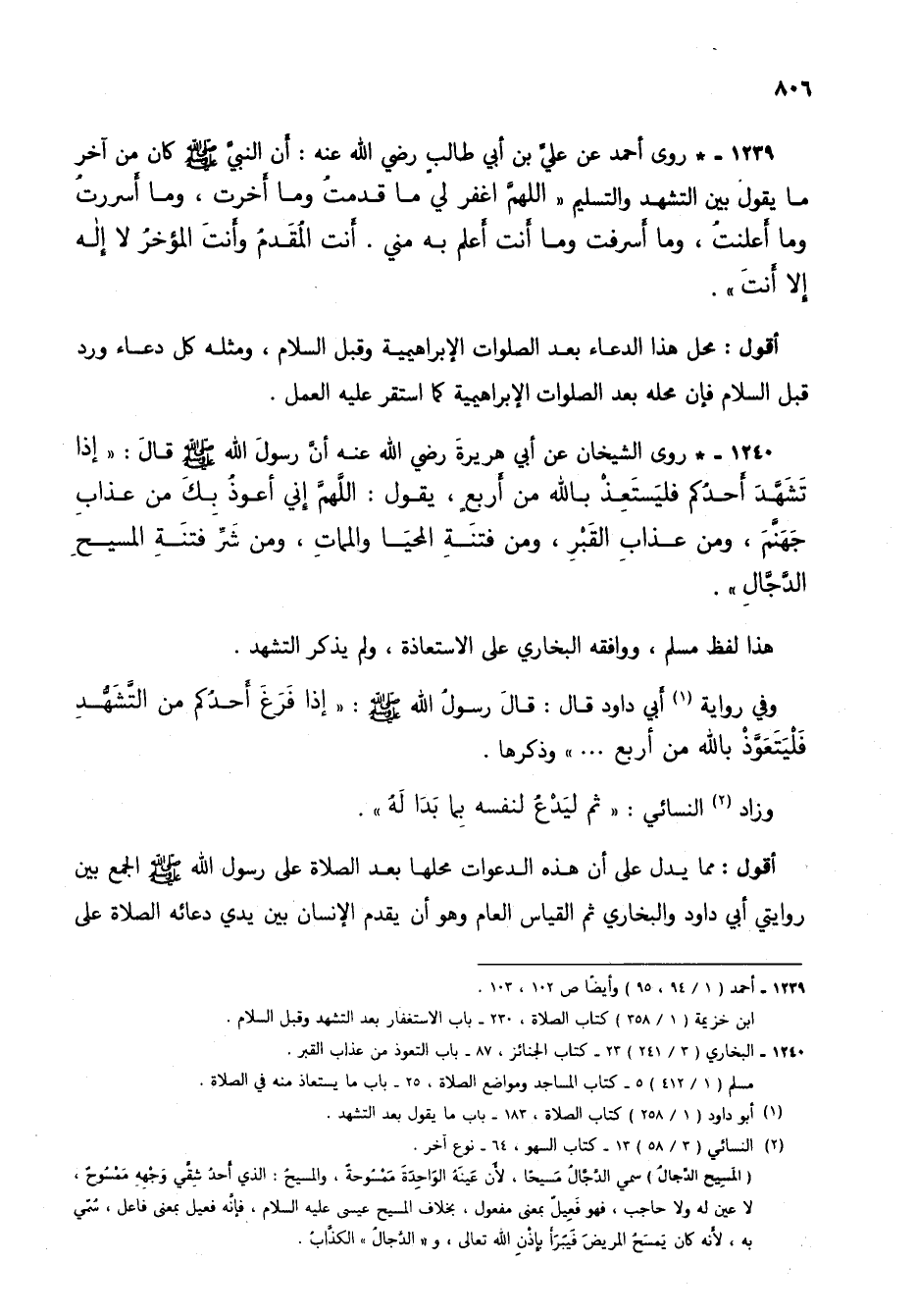 1240 - * روى الشيخان عن أبي هريرة رضي الله عنه أن رسول الله صلى الله عليه وسلم قال: "إذا تشهد أحدكم فليستعذ بالله من أربع، يقول: اللهم إني أعوذ بك من عذاب جهنم، ومن عذاب القبر، ومن فتنة المحيا والممات، ومن شر فتنة المسيح الدجال".