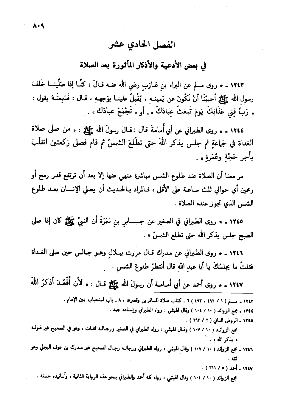 1244 - * روى الطبراني عن أبي أمامة قال: قال رسول الله صلى الله عليه وسلم: "من صلى صلاة الغداة في جماعة ثم جلس يذكر الله حتى تطلع الشمس ثم قام فصلى ركعتين انقلب بأجر حجة وعمرة".