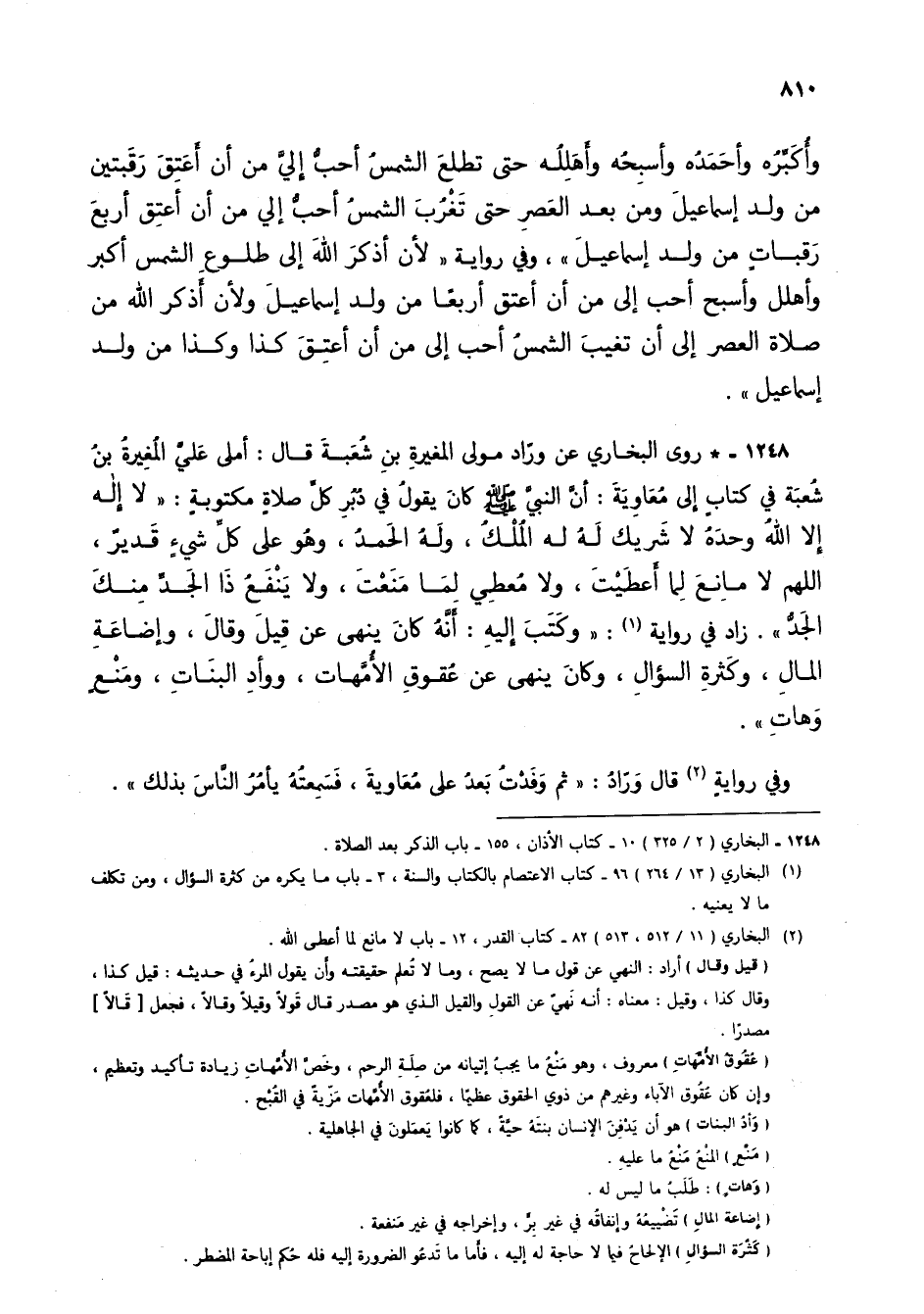 1248 - * روى البخاري عن وراد مولى المغيرة بن شعبة قال: أملى علي المغيرة بن شعبة في كتاب إلى معاوية: أن النبي صلى الله عليه وسلم كان يقول في دبر كل صلاة مكتوبة: "لا إله إلا الله وحده لا شريك له له الملك، وله الحمد، وهو على كل شيء قدير، اللهم لا مانع لما أعطيت، ولا معطي لما منعت، ولا ينفع ذا الجد منك الجد". زاد في رواية (2): "وكتب إليه: أنه كان ينهى عن قيل وقال، وإضاعة المال، وكثرة السؤال، وكان ينهى عن عقوق الأمهات، ووأد البنات، ومنع وهات".