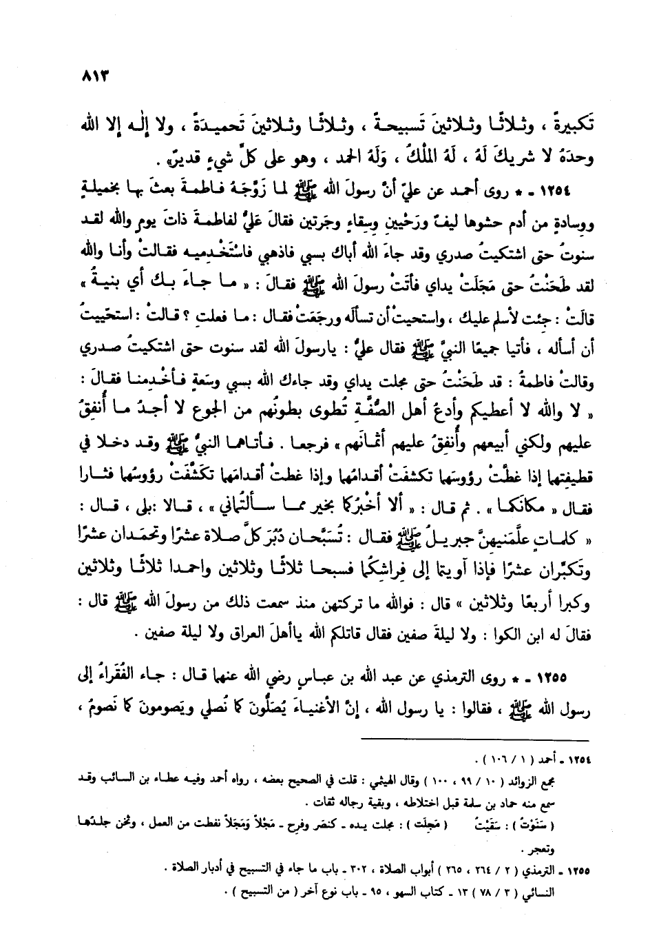 1254 - * روى أحمد عن علي أن رسول الله صلى الله عليه وسلم لما زوجه فاطمة بعث بها بخميلة ووسادة من أدم حشوها ليف ورحيين وسقاء وجرتين فقال علي لفاطمة ذات يوم والله لقد سنوت حتى اشتكيت صدري وقد جاء الله أباك بسبي فاذهبي فاستخدميه فقالت وأنا والله لقد طحنت حتى مجلت يداي فأتت رسول الله صلى الله عليه وسلم فقال: "ما جاء بك أي بنية" قالت: جئت لأسلم عليك، واستحيت أن تسأله ورجعت فقال: ما فعلت؟ قالت: استحييت أن أسأله، فأتيا جميعاً النبي صلى الله عليه وسلم فقال علي: يا رسول الله لقد سنوت حتى اشتكيت صدري وقالت فاطمة: قد طحنت حتى مجلت يداي وقد جاءك الله بسبي وسعة فأخذ منا فقال: "لا والله لا أعطيكم وأدع أهل الصفة تطوى بطونهم من الجوع لا أجد ما أنفق عليهم ولكني أبيعهم وأنفق عليهم أثمانهم" فرجعا. فأتاهما النبي صلى الله عليه وسلم وقد دخلا في قطيفتهما إذا غطت رؤوسهما تكشفت أقدامهما وإذا غطت أقدامهما تكشفت رؤوسهما فثارا فقال "مكانكما". ثم قال: "ألا أخبركما بخير مما سألتماني"، قالا: بلى، قال: "كلمات علمنيهن جبريل صلى الله عليه وسلم فقال: تسبحان دبر كل صلاة عشراً وتحمدان عشراً وتكبران عشراً فإذا آويتما إلى فراشكما فسبحا ثلاثاً وثلاثين واحمدا ثلاثاً وثلاثين وكبرا أربعاً وثلاثين" قال: فو الله ما تركتهن منذ سمعت ذلك من رسول الله صلى الله عليه وسلم قال: فقال له ابن الكوا: ولا ليلة صفين فقال قاتلكم الله يا أهل العراق ولا ليلة صفين.