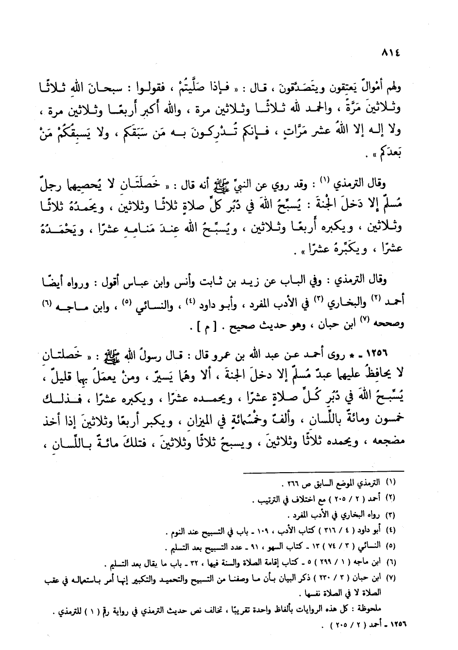 1256 - * روى أحمد عن عبد الله بن عمرو قال: قال رسول الله صلى الله عليه وسلم: "خصلتان لا يحافظ عليهما عبد مسلم إلا دخل الجنة، ألا وهما يسير، ومن يعمل بهما قليل، يسبح الله في دبر كل صلاة عشراً، ويحمده عشراً، ويكبره عشراً، فذلك خمسون ومائة باللسان، وألف وخمسمائة في الميزان، ويكبر أربعاً وثلاثين إذا أخذ مضجعه، ويحمده ثلاثاً وثلاثين، ويسبح ثلاثاً وثلاثين، فتلك مائة باللسان،