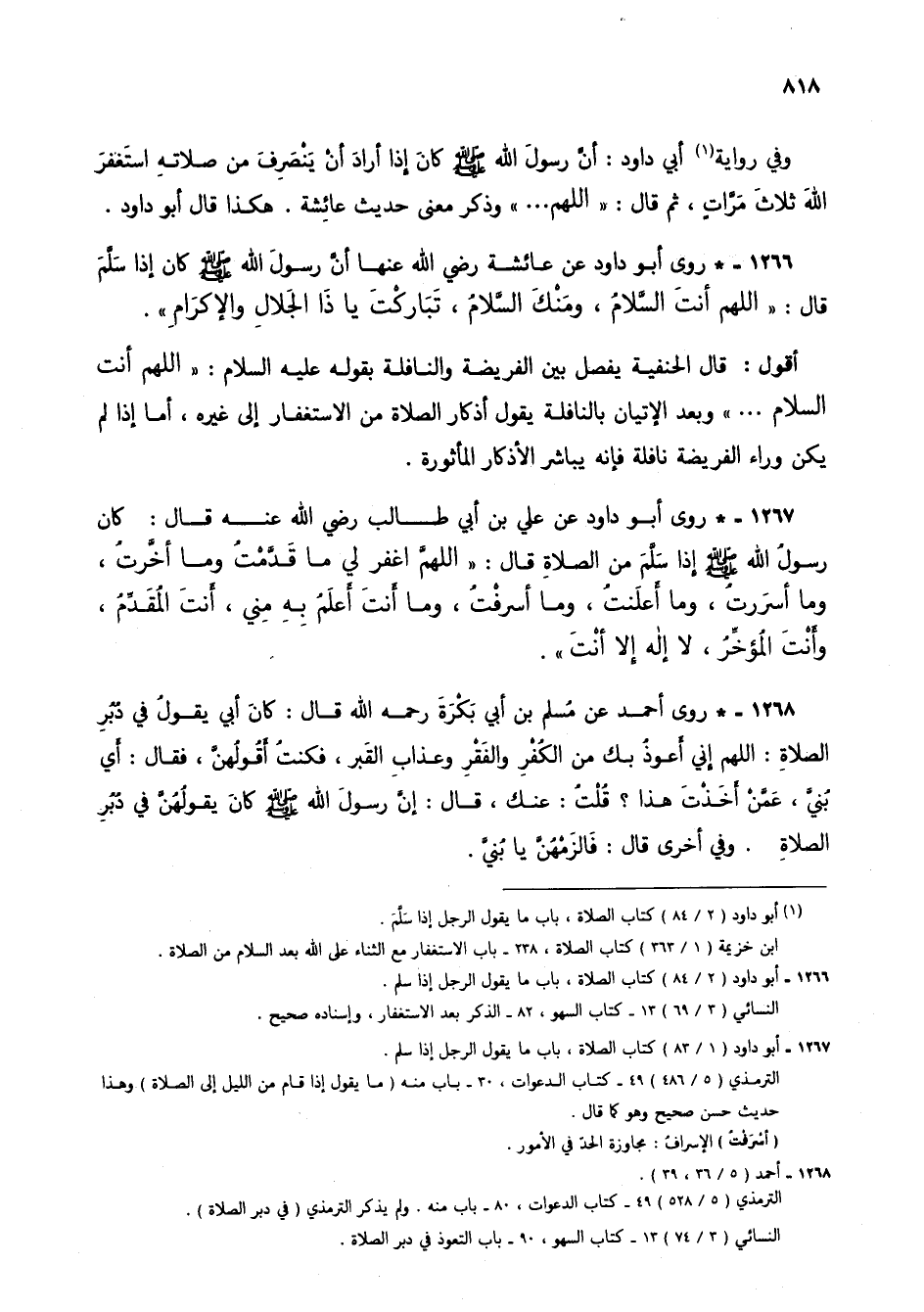 1266 - * روى أبو داود عن عائشة رضي الله عنها أن رسول الله صلى الله عليه وسلم كان إذا سلم قال: "اللهم أنت السلام، ومنك السلام، تباركت يا ذا الجلال والإكرام".
