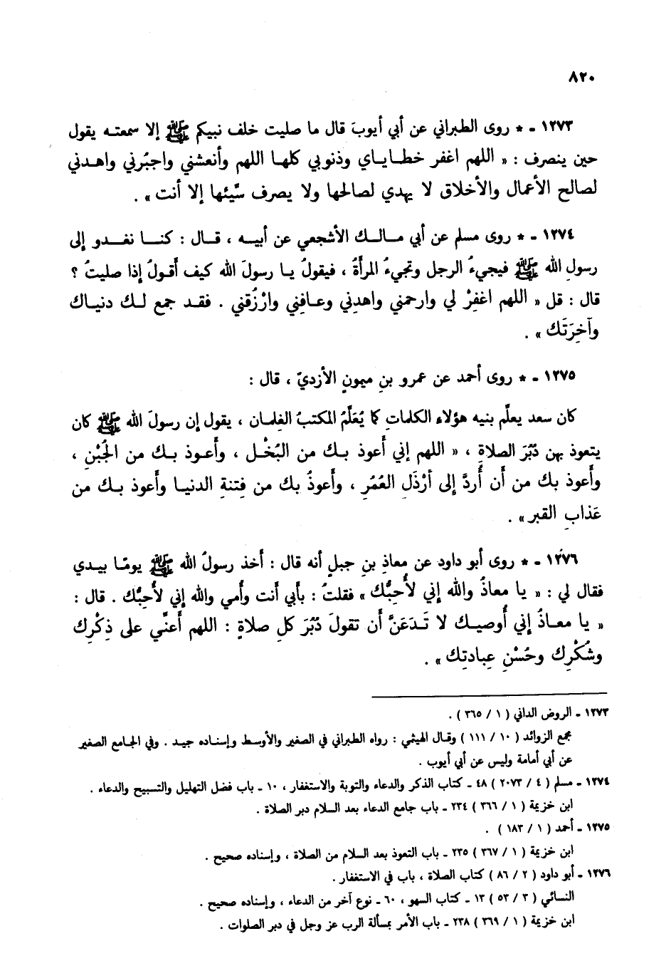 1273 - * روى الطبراني عن أبي أيوب قال ما صليت خلف نبيكم صلى الله عليه وسلم إلا سمعته يقول حين ينصرف: "اللهم اغفر خطاياي وذنوبي كلها اللهم وأنعشني واجبرني واهدني لصالح الأعمال والأخلاق لا يهدي لصالحها ولا يصرف سيئها إلا أنت".