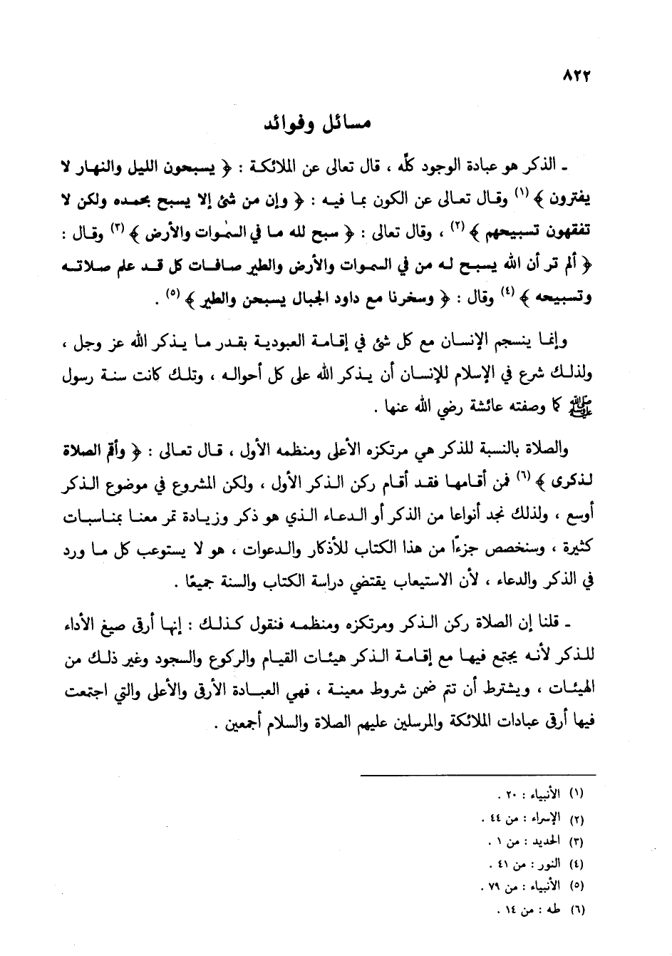 والصلاة بالنسبة للذكر هي مرتكزه الأعلى ومنظمه الأول، قال تعالى: (وأقم الصلاة لذكري) (6) فمن أقامها فقد أقام ركن الذكر الأول، ولكن المشروع في موضوع الذكر أوسع، ولذلك نجد أنواعاً من الذكر أو الدعاء الذي هو ذكر وزيادة تمر معنا بمناسبات كثيرة، وسنخصص جزءاً من هذا الكتاب للأذكار والدعوات، هو لا يستوعب كل ما ورد في الذكر والدعاء، لأن الاستيعاب يقتضي دراسة الكتاب والسنة جميعاً.
