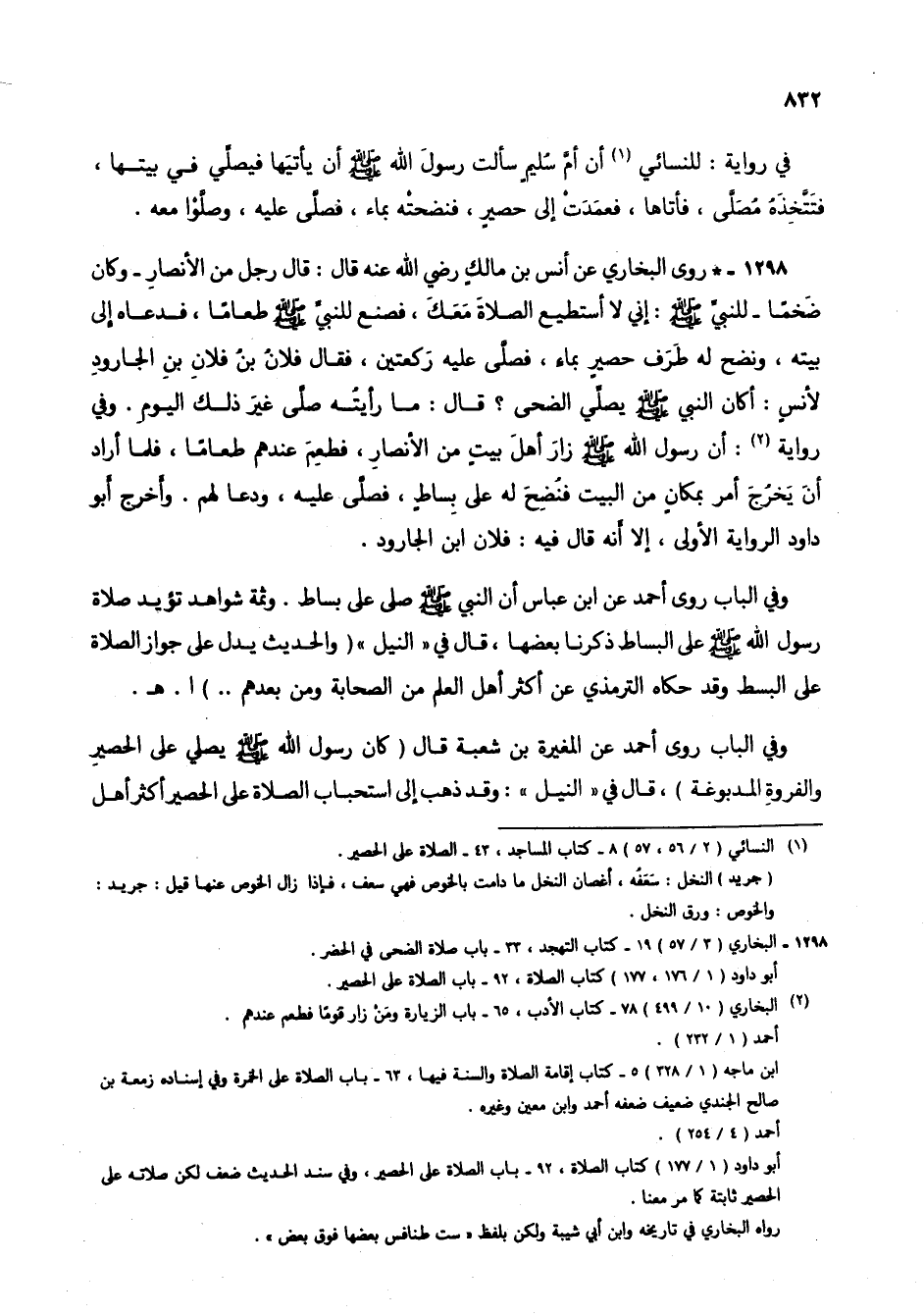 1298 - * روى البخاري عن أنس بن مالك رضي الله عنه قال: قال رجل من الأنصار- وكان ضخماً- للنبي صلى الله عليه وسلم: إني لا أستطيع الصلاة معك، فصنع للنبي صلى الله عليه وسلم طعاماً، فدعاه إلى بيته، ونضح له طرف حصير بماء، فصلى عليه ركعتين، فقال فلان بن فلان بن الجارود لأنس: أكان النبي صلى الله عليه وسلم يصلي الضحى؟ قال: ما رأيته صلى غير ذلك اليوم. وفي رواية (2): أن رسول الله صلى الله عليه وسلم زار أهل بيت من الأنصار، فطعم عندهم طعاماً، فلما أراد أن يخرج أمر بمكان من البيت فنضح له على بساط، فصلى عليه، ودعا لهم. وأخرج أبو داود الرواية الأولى، إلا أنه قال فيه: فلان ابن الجارود.