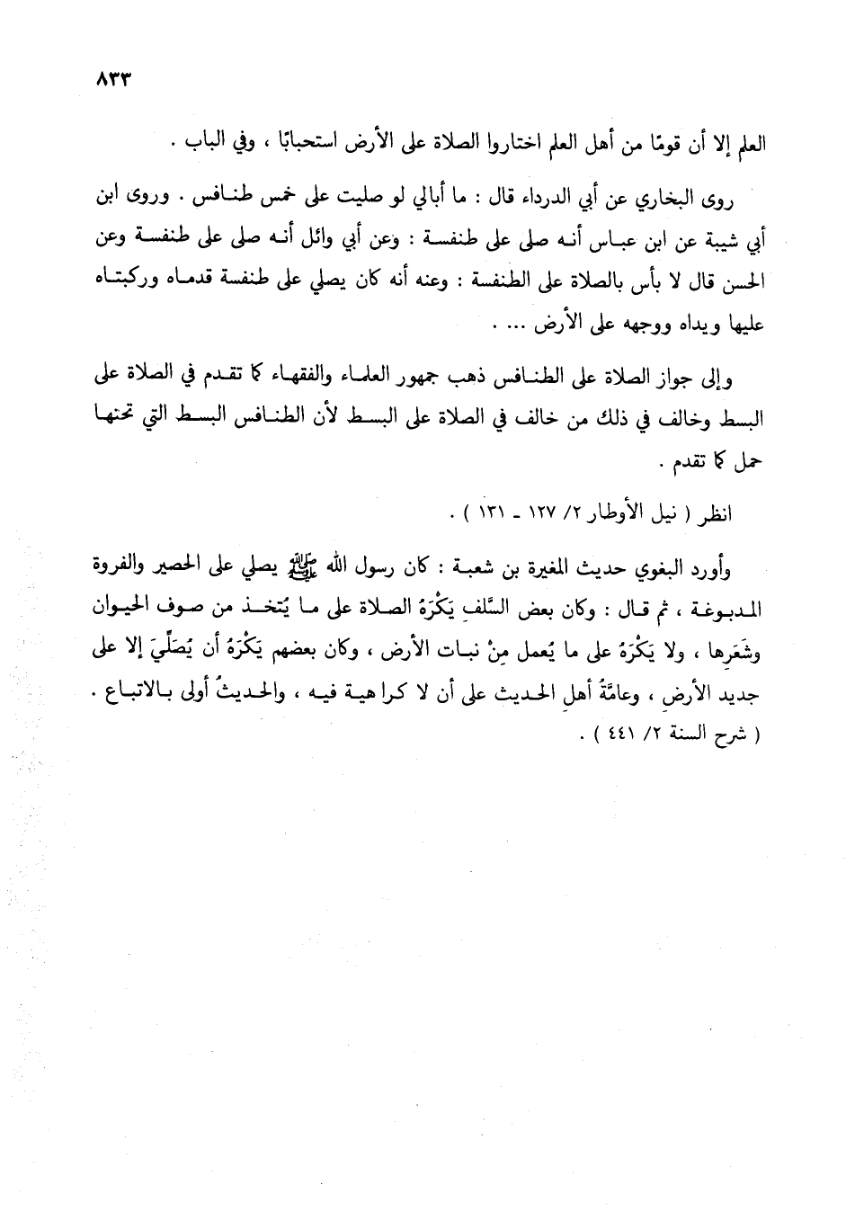 وأورد البغوي حديث المغيرة بن شعبة: كان رسول الله صلى الله عليه وسلم يصلي على الحصير والفروة المدبوغة، ثم قال: وكان بعض السلف يكره الصلاة على ما يتخذ من صوف الحيوان وشعرها، ولا يكره على ما يعمل من نبات الأرض، وكان بعضهم يكره أن يصلي إلا على جديد الأرض، وعامة أهل الحديث على أن لا كراهية فيه، والحديث أولى بالاتباع. (شرح السنة 2/ 441).