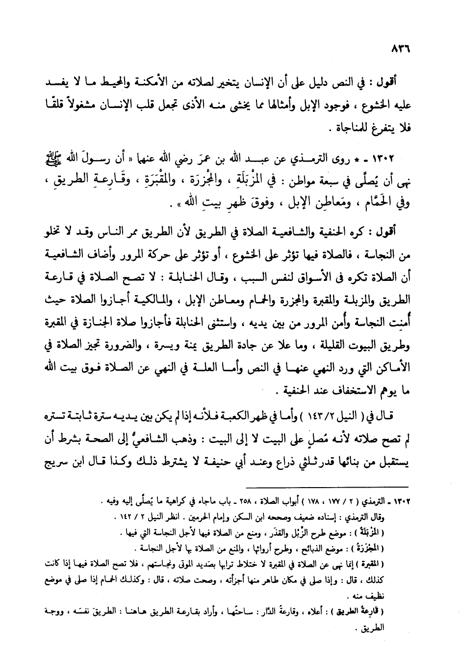 1302 - * روى الترمذي عن عبد الله بن عمر رضي الله عنهما "أن رسول الله صلى الله عليه وسلم نهى أن يصلى في سبعة مواطن: في المزبلة، والمجزرة، والمقبرة، وقارعة الطريق، وفي الحمام، ومعاطن الإبل، وفوق ظهر بيت الله".