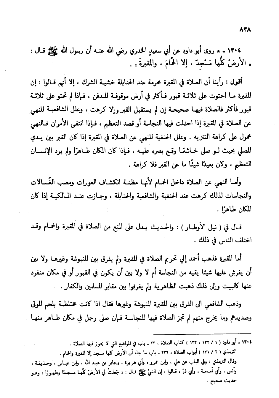 1304 - * روى أبو داود عن أبي سعيد الخدري رضي الله عنه أن رسول الله صلى الله عليه وسلم قال: "الأرض كلها مسجد، إلا الحمام، والمقبرة".