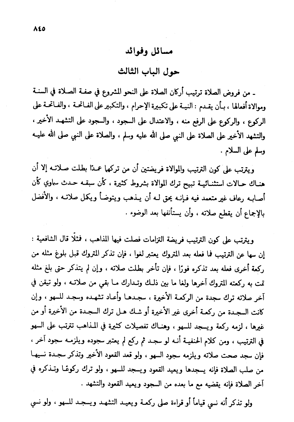 - من فروض الصلاة ترتيب أركان الصلاة على النحو المشروع في صفة الصلاة في السنة وموالاة أفعالها، بأن يقدم: النية على تكبيرة الإحرام، والتكبير على الفاتحة، والفاتحة على الركوع، والركوع على الرفع منه، والاعتدال على السجود، والسجود على التشهد الأخير، والتشهد الأخير على الصلاة على النبي صلى الله عليه وسلم، والصلاة على النبي صلى الله عليه وسلم على السلام.
