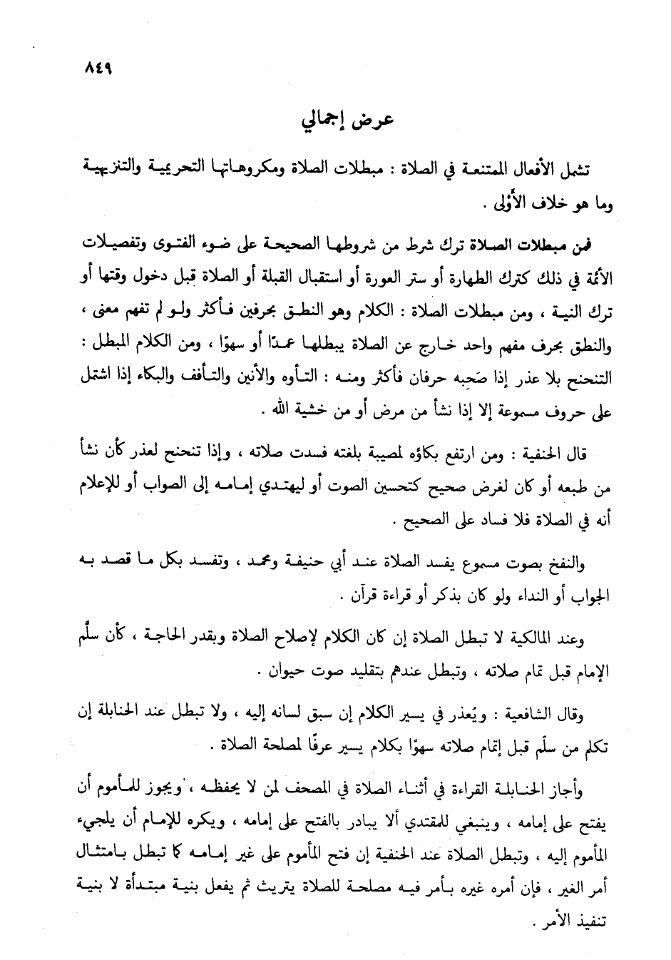 فمن مبطلات الصلاة ترك شرط من شروطها الصحيحة على ضوء الفتوى وتفصيلات الأئمة في ذلك كترك الطهارة أو ستر العورة أو استقبال القبلة أو الصلاة قبل دخول وقتها أو ترك النية، ومن مبطلات الصلاة: الكلام وهو النطق بحرفين فأكثر ولو لم تفهم معنى، والنطق بحرف مفهم واحد خارج عن الصلاة يبطلها عمداً أو سهواً، ومن الكلام المبطل: التنحنح بلا عذر إذا صحبه حرفان فأكثر ومنه: التأوه والأنين والتأفف والبكاء إذا اشتمل على حروف مسموعة إلا إذا نشأ من مرض أو من خشية الله.