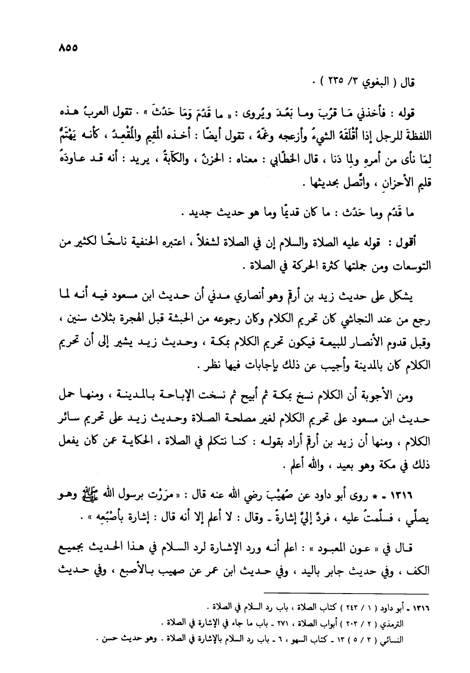 1316 - أبو داود (1/ 243) كتاب الصلاة، باب رد السلام في الصلاة.
