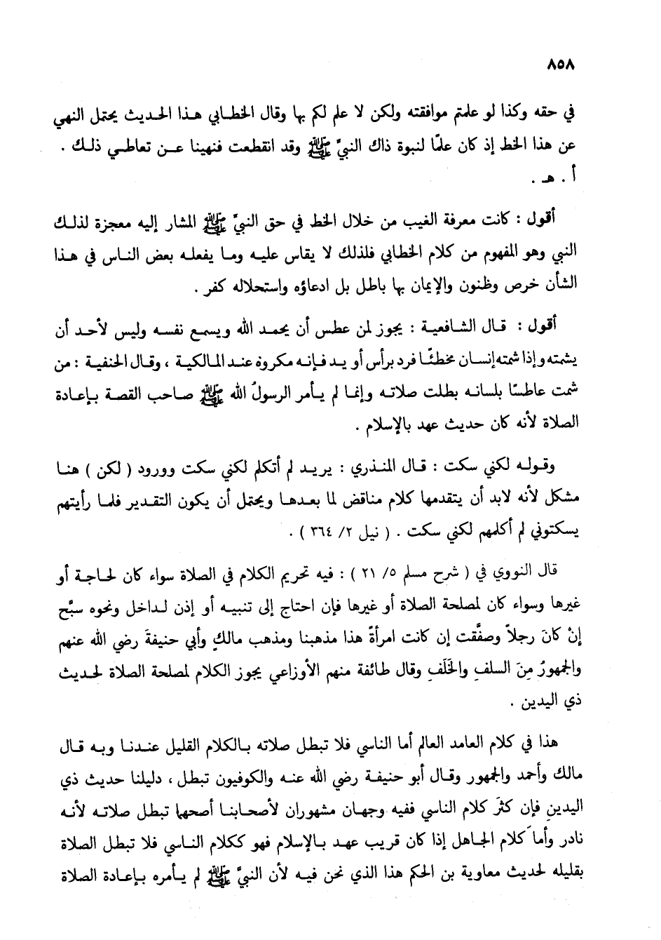 قال النووي في (شرح مسلم 5/ 21): فيه تحريم الكلام في الصلاة سواء كان لحاجة أو غيرها وسواء كان لمصلحة الصلاة أو غيرها فإن احتاج إلى تنبيه أو إذن لداخل ونحوه سبح إن كان رجلاً وصفقت إن كانت امرأة هذا مذهبنا ومذهب مالك وأبي حنيفة رضي الله عنهم الجمهور من السلف والخلف وقال طائفة منهم الأوزاعي يجوز الكلام لمصلحة الصلاة لحديث ذي اليدين.