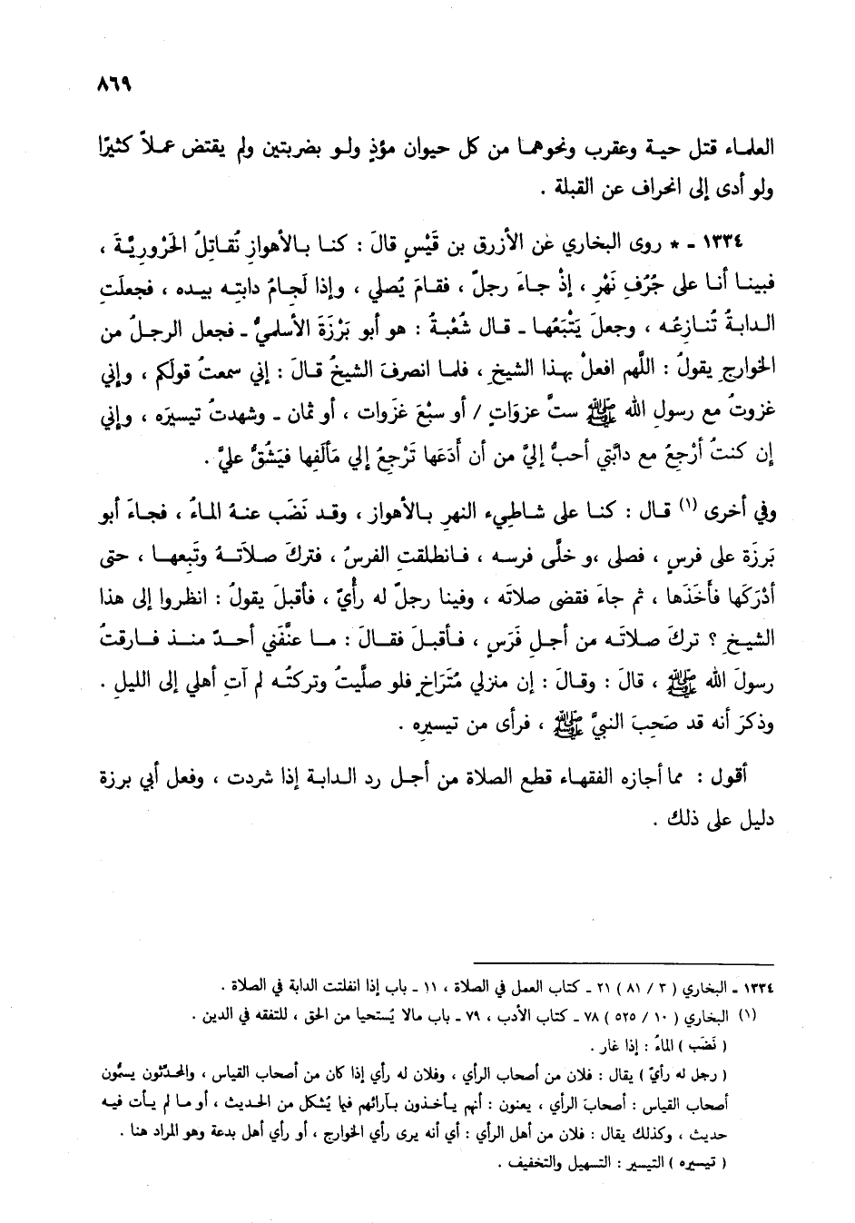 1334 - * روى البخاري عن الأزرق بن قيس قال: كنا بالأهواز نقاتل الحرورية، فبينا أنا على جرف نهر، إذ جاء رجل، فقام يصلي، وإذا لجام دابته بيده، فجعلت الدابة تنازعه، وجعل يتبعها- قال شعبة: هو أبو برزة الأسلمي- فجعل الرجل من الخوارج يقول: اللهم افعل بهذا الشيخ، فلما انصرف الشيخ قال: إني سمعت قولكم، وإني غزوت مع رسول الله صلى الله عليه وسلم ست عزوات/ أو سبع غزوات، أو ثمان- وشهدت تيسيره، وإني إن كنت أرجع مع دابتي أحب إلي من أن أدعها ترجع إلي مألفها فيشق علي.