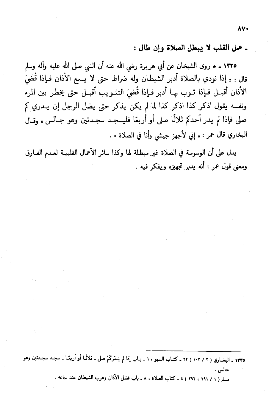 1335 - * روى الشيخان عن أبي هريرة رضي الله عنه أن النبي صلى الله عليه وآله وسلم قال: "إذا نودي بالصلاة أدبر الشيطان وله ضراط حتى لا يسمع الأذان فإذا قضي الأذان أقبل فإذا ثوب بها أدبر فإذا قضي التثويب أقبل حتى يخطر بين المرء ونفسه يقول اذكر كذا اذكر كذا لما لم يكن يذكر حتى يضل الرجل إن يدري كم صلى فإذا لم يدر أحدكم ثلاثاً صلى أو أربعاً فليسجد سجدتين وهو جالس" وقال البخاري قال عمر: "إني لأجهز جيشي وأنا في الصلاة".
