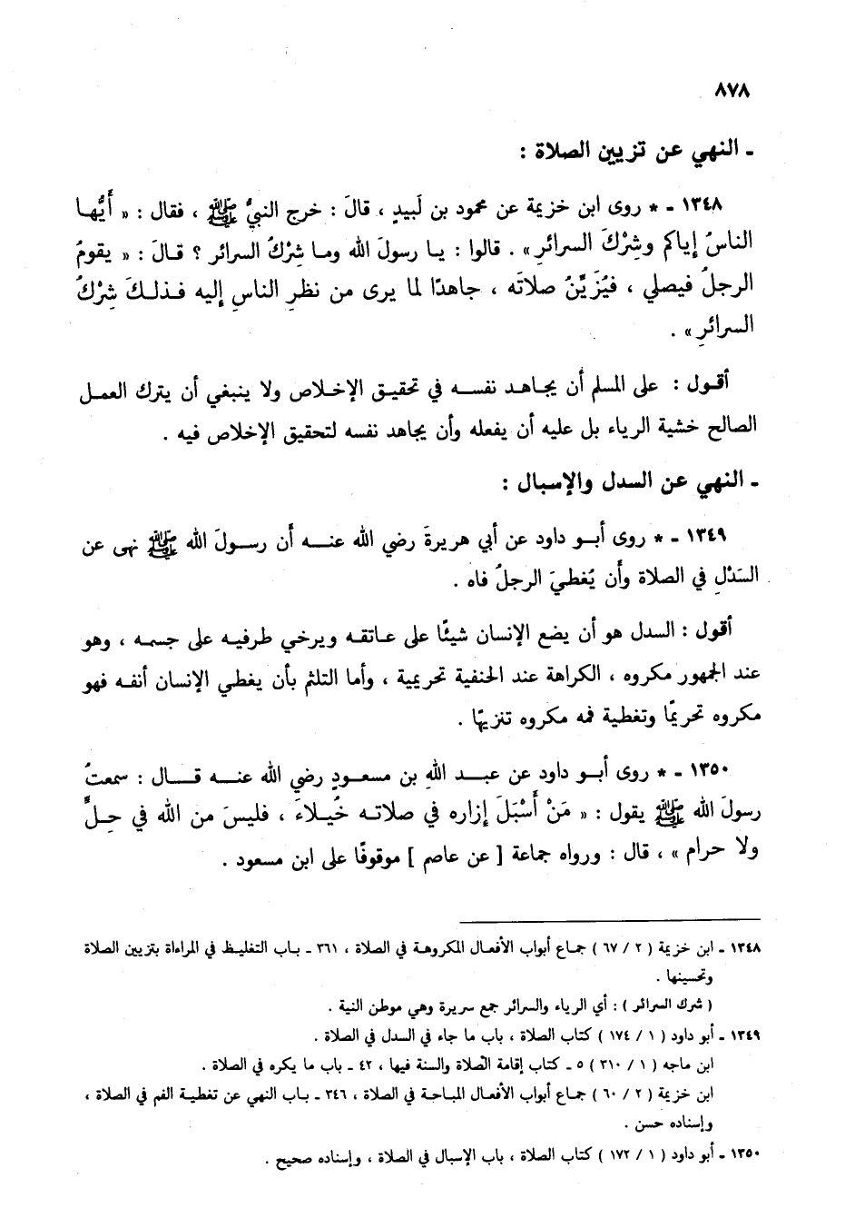 1350 - * روى أبو داود عن عبد الله بن مسعود رضي الله عنه قال: سمعت رسول الله صلى الله عليه وسلم يقول: "من أسبل إزاره في صلاته خيلاء، فليس من الله في حل ولا حرام"، قال: ورواه جماعة [عن عاصم] موقوفاً على ابن مسعود.