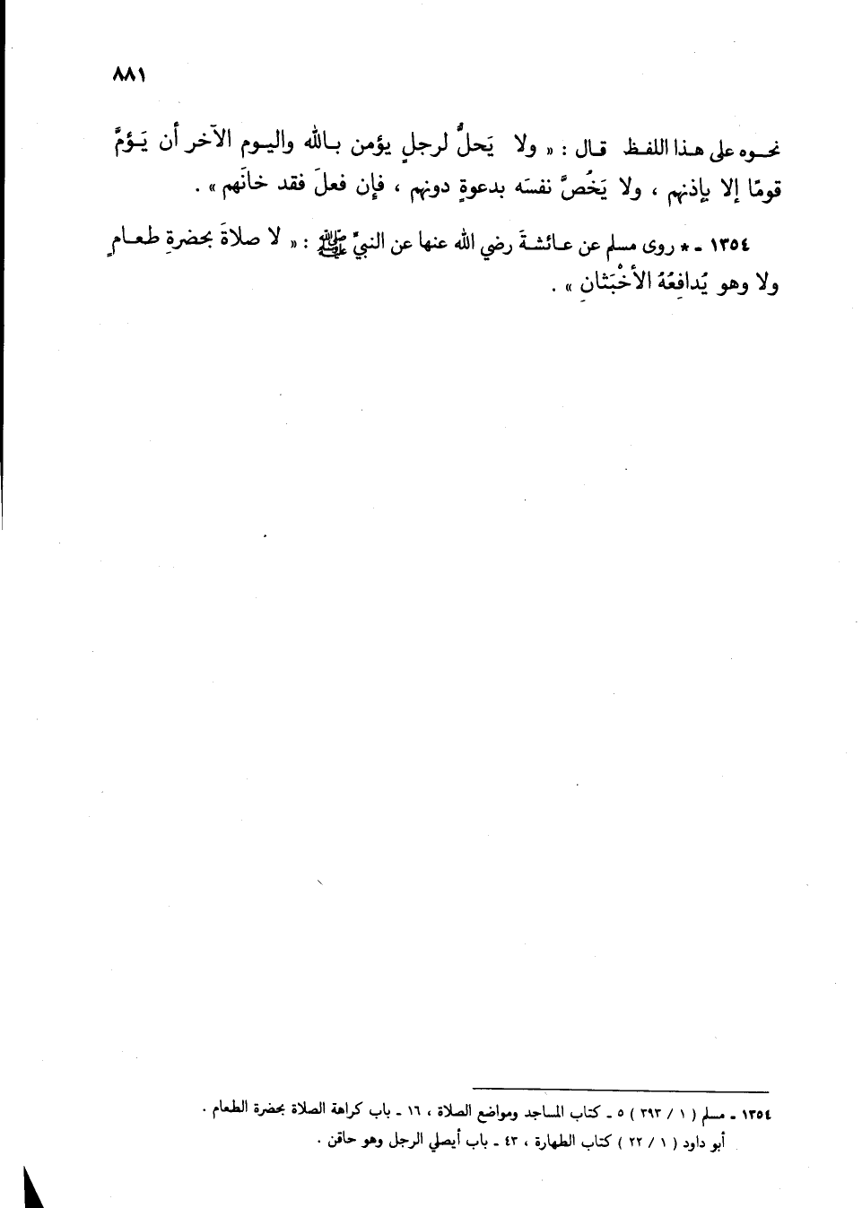 1354 - * روى مسلم عن عائشة رضي الله عنها عن النبي صلى الله عليه وسلم: "لا صلاة بحضرة طعام ولا وهو يدافعه الأخبثان".