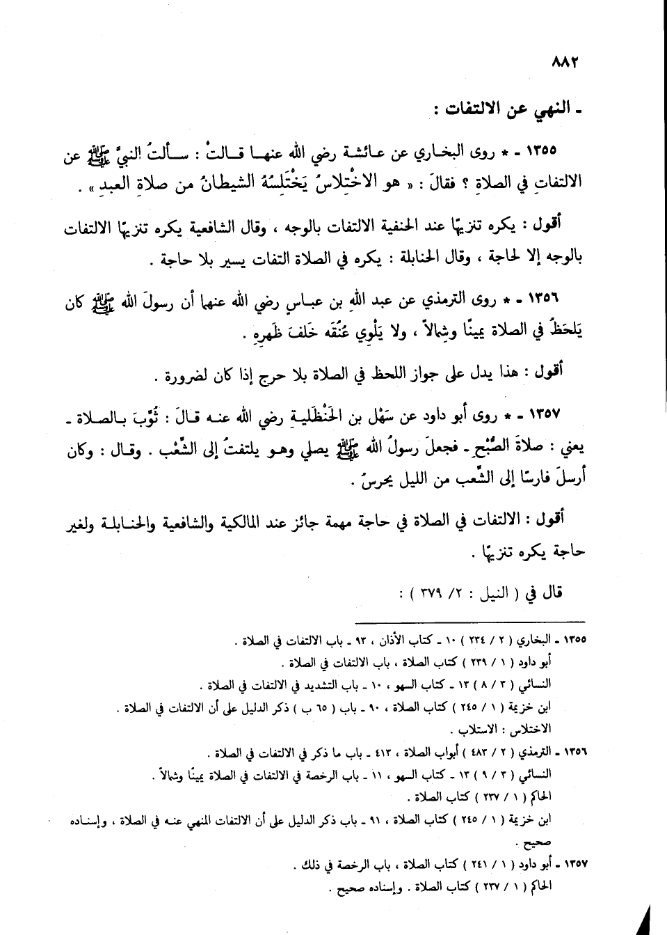 1355 - * روى البخاري عن عائشة رضي الله عنها قالت: سألت النبي صلى الله عليه وسلم عن الالتفات في الصلاة؟ فقال: "هو الاختلاس يختلسه الشيطان من صلاة العبد".