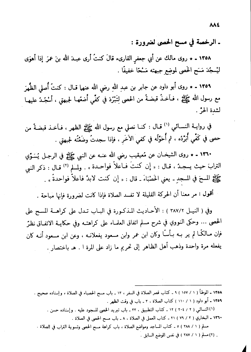 1360 - * روى الشيخان عن معيقيب رضي الله عنه عن النبي صلى الله عليه وسلم في الرجل يسوي التراب حيث يسجد، قال: "إن كنت فاعلاً فواحدة". ولمسلم (5) قال: ذكر النبي صلى الله عليه وسلم المسح في المسجد- يعني الحصباء- قال: "إن كنت لابد فاعلاًُ فواحدة".
