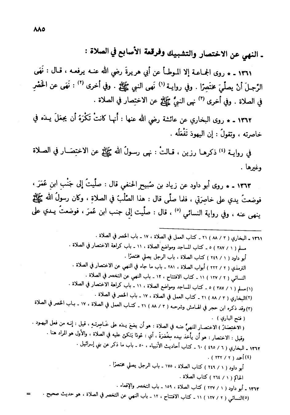 1361 - * روى الجماعة إلا الموطأ عن أبي هريرة رضي الله عنه يرفعه، قال: نهى الرجل أن يصلي مختصراً. وفي رواية (2) نهى النبي صلى الله عليه وسلم. وفي أخرى (3): نهى عن الخصر في الصلاة. وفي أخرى (4) نهى النبي صلى الله عليه وسلم عن الاختصار في الصلاة.