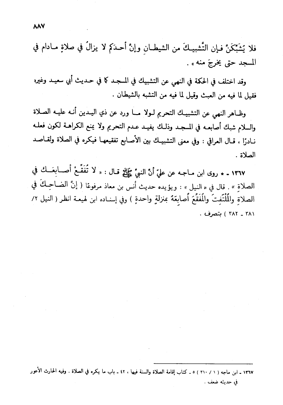 1367 - * روى ابن ماجه عن علي أن النبي صلى الله عليه وسلم قال: "لا تفقع أصابعك في الصلاة". قال في "النيل": ويؤيده حديث أنس بن معاذ مرفوعاً (إن الضاحك في الصلاة والملتفت والمفقع أصابعه بمنزلة واحدة) وفي إسناده ابن لهيعة انظر (النيل 2/ 381 - 382) بتصرف.