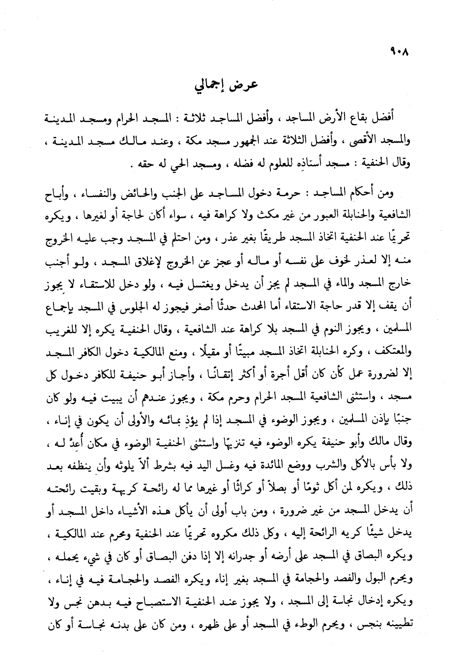 ومن أحكام المساجد: حرمة دخول المساجد على الجنب والحائض والنفساء، وأباح الشافعية والحنابلة العبور من غير مكث ولا كراهة فيه، سواء أكان لحاجة أو لغيرها، ويكره تحريماً عند الحنفية اتخاذ المسجد طريقاً بغير عذر، ومن احتلم في المسجد وجب عليه الخروج منه إلا لعذر لخوف على نفسه أو ماله أو عجز عن الخروج لإغلاق المسجد، ولو أجنب خارج المسجد والماء في المسجد لم يجز أن يدخل ويغتسل فيه، ولو دخل للاستقاء لا يجوز أن يقف إلا قدر حاجة الاستقاء أما المحدث حدثاً أصغر فيجوز له الجلوس في المسجد بإجماع المسلمين، ويجوز النوم في المسجد بلا كراهة عند الشافعية، وقال الحنفية يكره إلا للغريب والمعتكف، وكره الحنابلة اتخاذ المسجد مبيتاً أو مقيلاً، ومنع المالكية دخول الكافر المسجد إلا لضرورة عمل كأن كان أقل أجرة أو أكثر إتقاناً، وأجاز أبو حنيفة للكافر دخول كل مسجد، واستثنى الشافعية المسجد الحرام وحرم مكة، ويجوز عندهم أن يبيت فيه ولو كان جنباً بإذن المسلمين، ويجوز الوضوء في المسجد إذا لم يؤذ بمائه والأولى أن يكون في إناء، وقال مالك وأبو حنيفة يكره الوضوء فيه تنزيهاً واستثنى الحنفية الوضوء في مكان أعد له، ولا بأس بالأكل والشرب ووضع المائدة فيه وغسل اليد فيه بشرط ألا يلوثه وأن ينظفه بعد ذلك، ويكره لمن أكل ثوماً أو بصلاً أو كراثاً أو غيرها مما له رائحة كريهة وبقيت رائحته أن يدخل المسجد من غير ضرورة، ومن باب أولى أن يأكل هذه الأشياء داخل المسجد أو يدخل شيئاً كريه الرائحة إليه، وكل ذلك مكروه تحريماً عند الحنفية ومحرم عند المالكية، ويكره البصاق في المسجد على أرضه أو جدرانه إلا إذا دفن البصاق أو كان في شيء يحمله، ويحرم البول والفصد والحجامة في المسجد بغير إناء ويكره الفصد والحجامة فيه في إناء، ويكره إدخال نجاسة إلى المسجد، ولا يجوز عند الحنفية الاستصباح فيه بدهن نجس ولا تطيينه بنجس، ويحرم الوطء في المسجد أو على ظهره، ومن كان على بدنه نجاسة أو كان