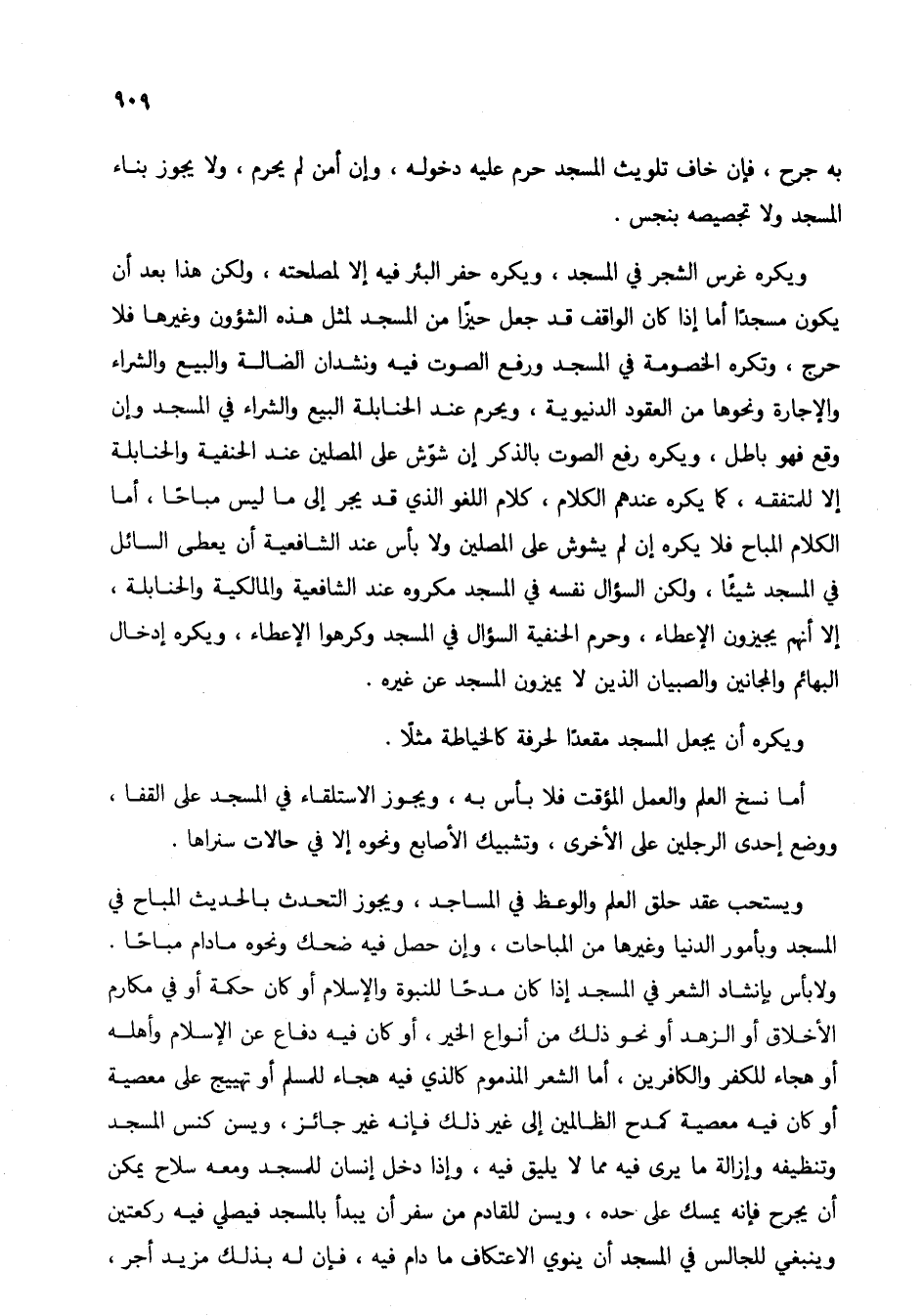 ويكره غرس الشجر في المسجد، ويكره حفر البئر فيه إلا لمصلحته، ولكن هذا بعد أن يكون مسجداً أما إذا كان الواقف قد جعل حيزاً من المسجد لمثل هذه الشؤون وغيرها فلا حرج، وتكره الخصومة في المسجد ورفع الصوت فيه ونشدان الضالة والبيع والشراء والإجارة ونحوها من العقود الدنيوية، ويحرم عند الحنابلة البيع والشراء في المسجد وإن وقع فهو باطل، ويكره رفع الصوت بالذكر إن شوش على المصلين عند الحنفية والحنابلة إلا للمتفقه، كما يكره عندهم الكلام، كلام اللغو الذي قد يجر إلى ما ليس مباحاً، أما الكلام المباح فلا يكره إن لم يشوش على المصلين ولا بأس عند الشافعية أن يعطى السائل في المسجد شيئاً، ولكن السؤال نفسه في المسجد مكروه عند الشافعية والمالكية والحنابلة، إلا أنهم يجيزون الإعطاء، وحرم الحنفية السؤال في المسجد وكرهوا الإعطاء، ويكره إدخال البهائم والمجانين والصبيان الذين لا يميزون المسجد عن غيره.