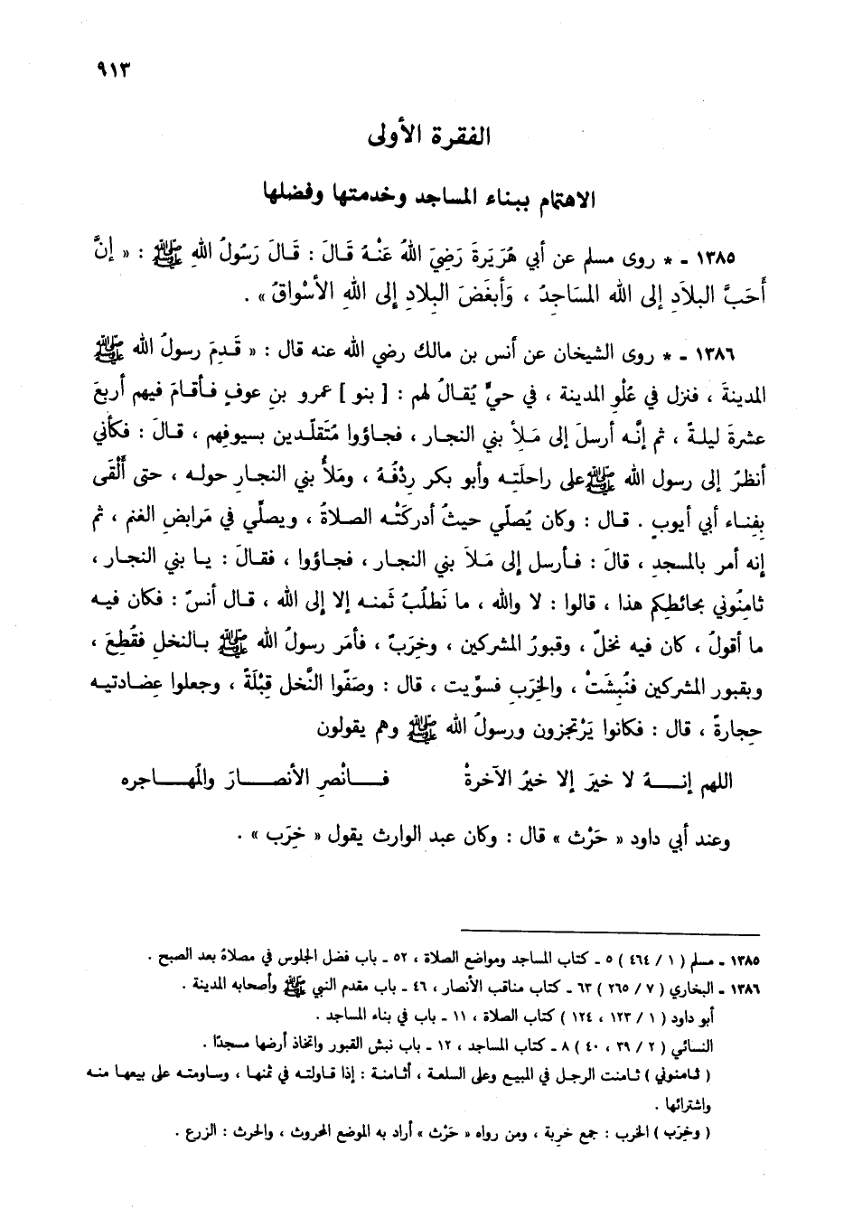 1386 - * روى الشيخان عن أنس بن مالك رضي الله عنه قال: "قدم رسول الله صلى الله عليه وسلم المدينة، فنزل في علو المدينة، في حي يقال لهم: [بنو] عمرو بن عوف فأقام فيهم أربع عشرة ليلة، ثم إنه أرسل إلى ملأ بني النجار، فجاؤوا متقلدين بسيوفهم، قال: فكأني أنظر إلى رسول الله صلى الله عليه وسلم على راحلته وأبو بكر ردفه، وملأ بني النجار حوله، حتى ألقى بفناء أبي أيوب. قال: وكان يصلي حيث أدركته الصلاة، ويصلي في مرابض الغنم، ثم إنه أمر بالمسجد، قال: فأرسل إلى ملأ بني النجار، فجاؤوا، فقال: يا بني النجار، ثامنوني بحائطكم هذا، قالوا: لا والله، ما نطلب ثمنه إلا إلى الله، قال أنس: فكان فيه ما أقول، كان فيه نخل، وقبور المشركين، وخرب، فأمر رسول الله صلى الله عليه وسلم بالنخل فقطع، وبقبور المشركين فنبشت، والخرب فسويت، قال: وصفوا النخل قبلة، وجعلوا عضادتيه حجارة، قال: فكانوا يرتجزون ورسول الله صلى الله عليه وسلم وهم يقولون: