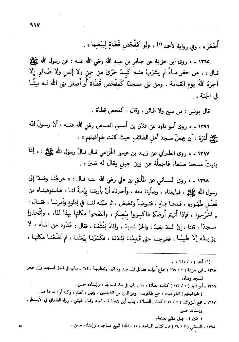 1395 - * روى ابن خزيمة عن جابر بن عبد الله رضي الله عنه: عن رسول الله صلى الله عليه وسلم قال: "من حفر ماء لم يشرب منه كبد حري من جن ولا إنس ولا طائر إلا آجره الله يوم القيامة. ومن بنى مسجداً كمفحص قطاة أو أصغر بنى الله له بيتاً في الجنة".