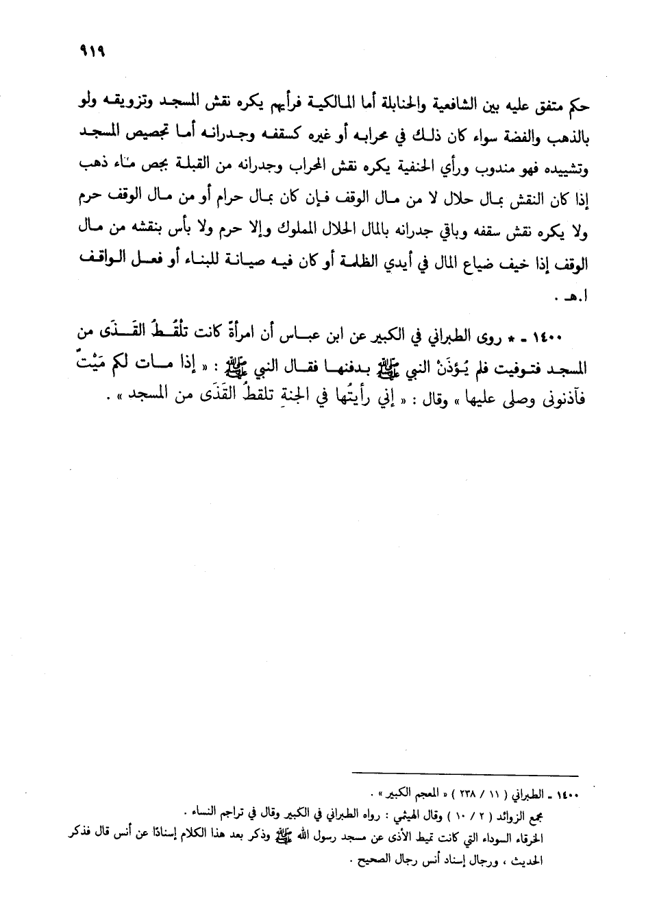 1400 - * روى الطبراني في الكبير عن ابن عباس أن امرأة كانت تلقط القذى من المسجد فتوفيت فلم يؤذن النبي صلى الله عليه وسلم بدفنها فقال النبي صلى الله عليه وسلم: "إذا مات لكم ميت فآذنوني وصلى عليها" وقال: "إني رأيتها في الجنة تلقط القذى من المسجد".