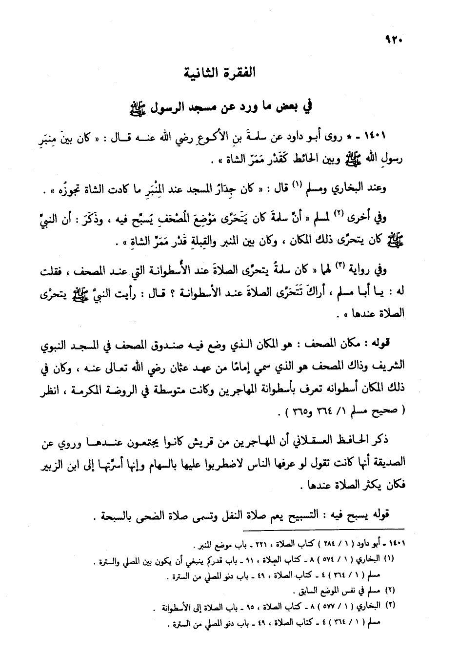 1401 - * روى أبو داود عن سلمة بن الأكوع رضي الله عنه قال: "كان بين منبر رسول الله صلى الله عليه وسلم وبين الحائط كقدر ممر الشاة".