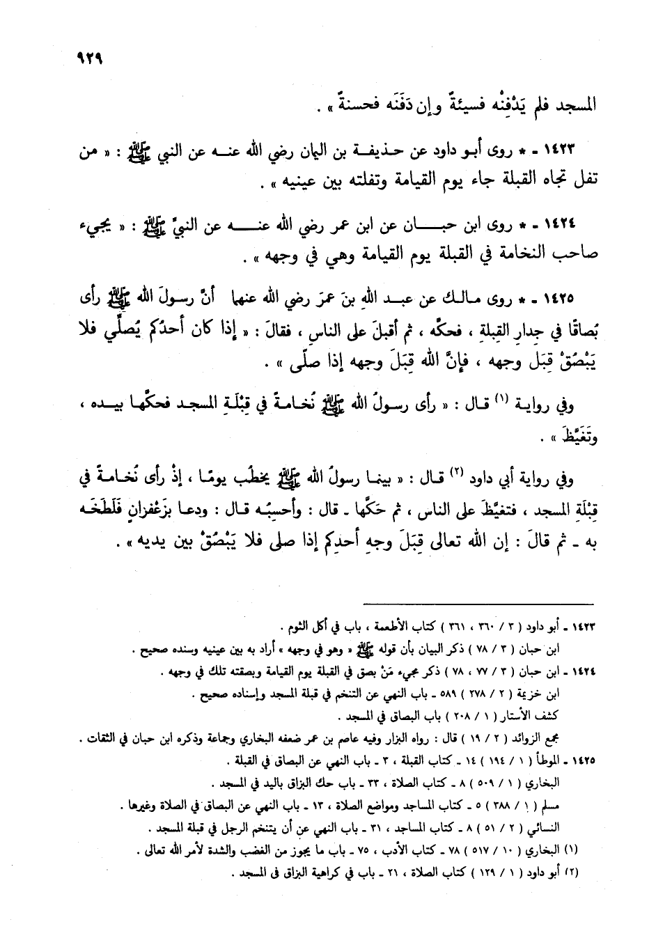 1424 - * روى ابن حبان عن ابن عمر رضي الله عنه عن النبي صلى الله عليه وسلم: "يجيء صاحب النخامة في القبلة يوم القيامة وهي في وجهه".
