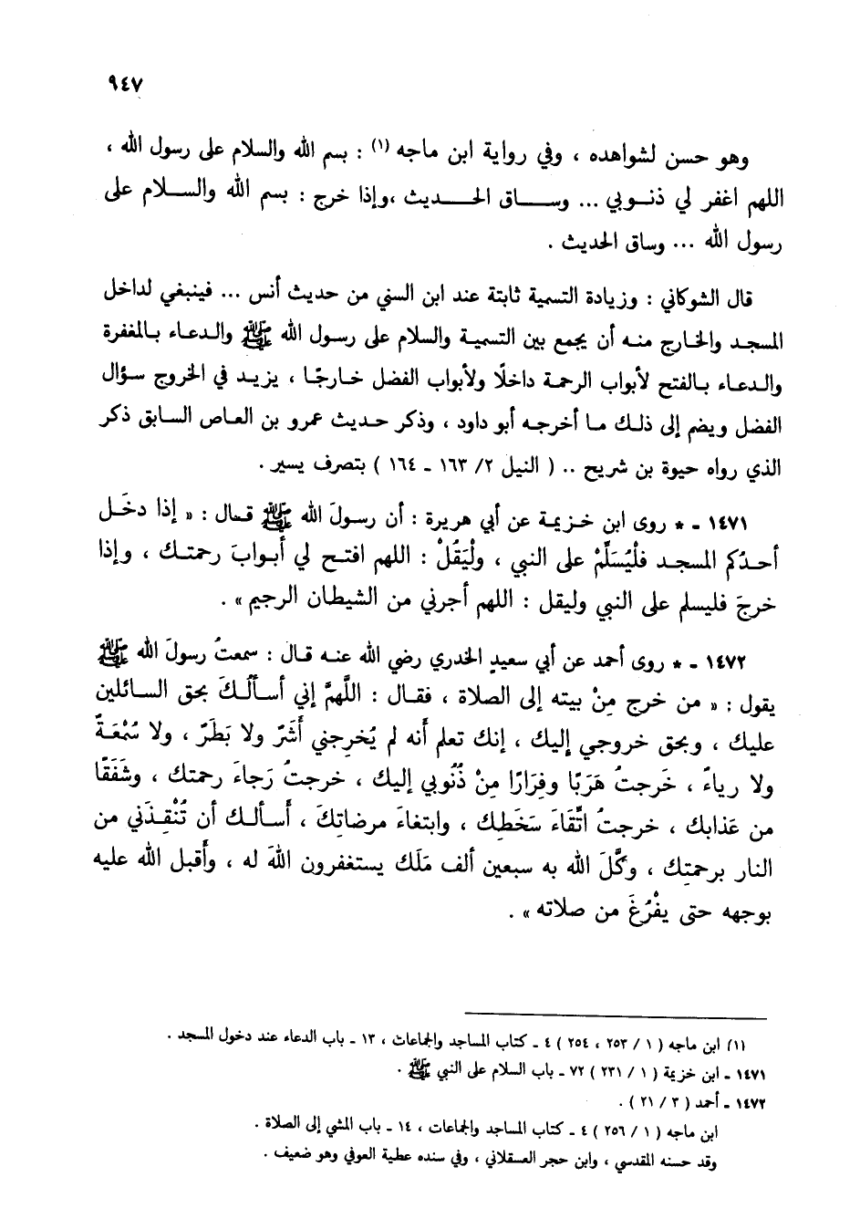 1471 - * روى ابن خزيمة عن أبي هريرة: أن رسول الله صلى الله عليه وسلم قال: "إذا دخل أحدكم المسجد فليسلم على النبي، وليقل: اللهم افتح لي أبواب رحمتك، وإذا خرج فليسلم على النبي وليقل: اللهم أجرني من الشيطان الرجيم".
