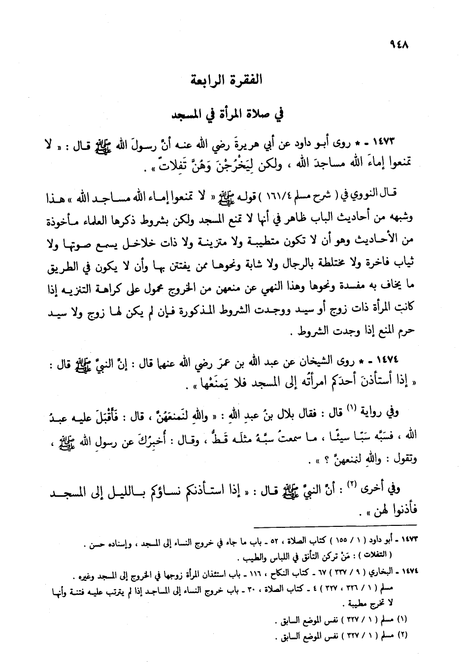 1474 - * روى الشيخان عن عبد الله بن عمر رضي الله عنهما قال: إن النبي صلى الله عليه وسلم قال: "إذا استأذن أحدكم امرأته إلى المسجد فلا يمنعها".