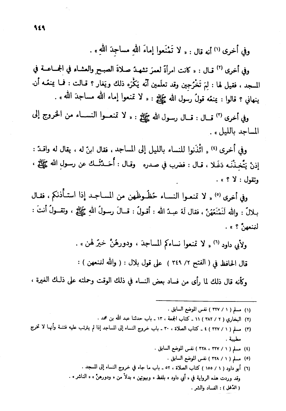 وفي أخرى (5) "لا تمنعوا النساء حظوظهن من المساجد إذا استأذنكم، فقال بلال: والله لنمنعهن، فقال له عبد الله: أقول: قال رسول الله صلى الله عليه وسلم، وتقول أنت: لنمنعهن؟ ".
