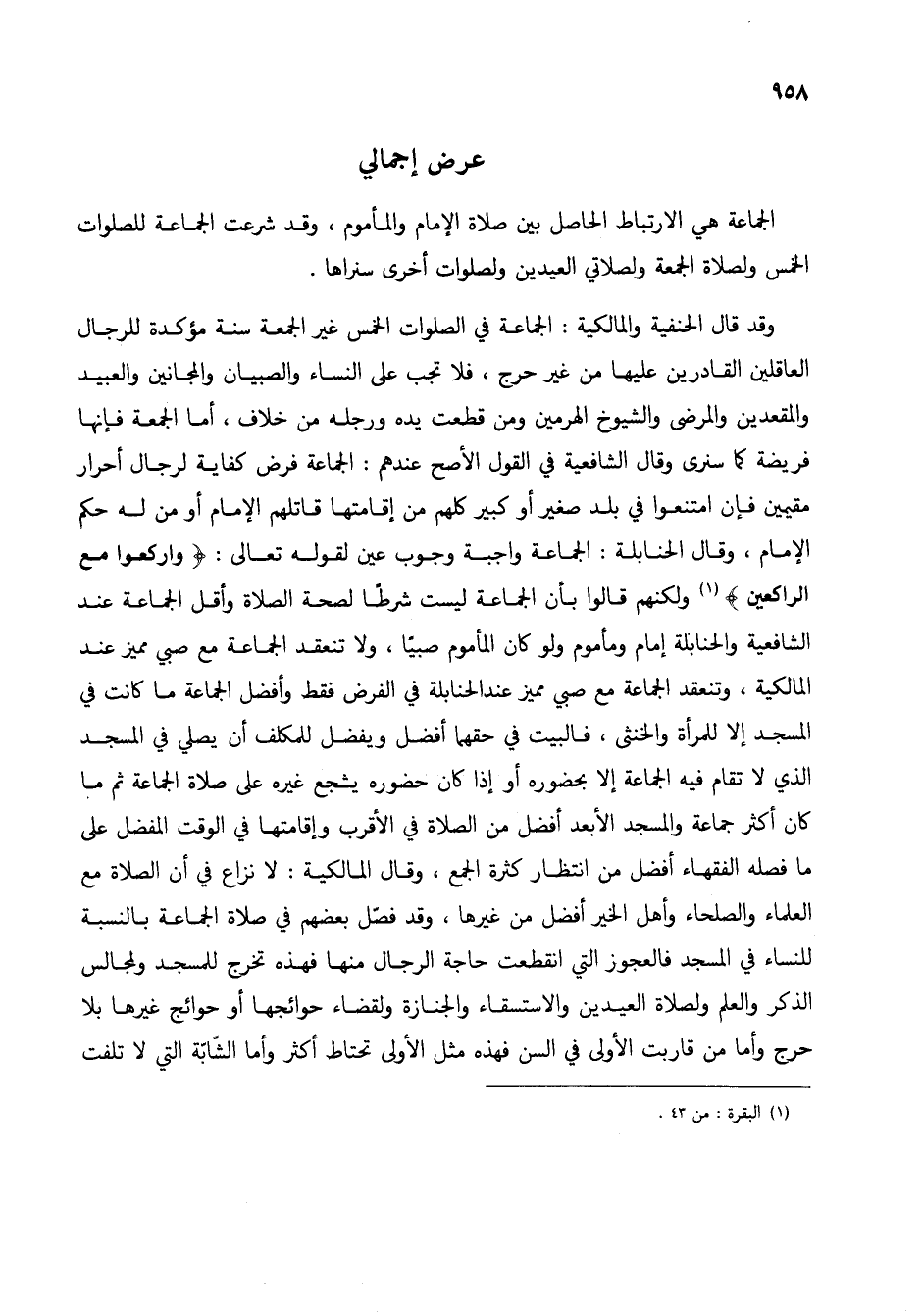 وقد قال الحنفية والمالكية: الجماعة في الصلوات الخمس غير الجمعة سنة مؤكدة للرجال العاقلين القادرين عليها من غير حرج، فلا تجب على النساء والصبيان والمجانين والعبيد والمقعدين والمرضى والشيوخ الهرمين ومن قطعت يده ورجله من خلاف، أما الجمعة فإنها فريضة كما سنرى وقال الشافعية في القول الأصح عندهم: الجماعة فرض كفاية لرجال أحرار مقيمين فإن امتنعوا في بلد صغير أو كبير كلهم من إقامتها قاتلهم الإمام أو من له حكم الإمام، وقال الحنابلة: الجماعة واجبة وجوب عين لقوله تعالى: (واركعوا مع الراكعين) (1) ولكنهم قالوا بأن الجماعة ليست شرطاً لصحة الصلاة وأقل الجماعة عند الشافعية والحنابلة إمام ومأموم ولو كان المأموم صبياً، ولا تنعقد الجماعة مع صبي مميز عند المالكية، وتنعقد الجماعة مع صبي مميز عند الحنابلة في الفرض فقط وأفضل الجماعة ما كانت في المسجد إلا للمرأة والخنثى، فالبيت في حقهما أفضل ويفضل للمكلف أن يصلي في المسجد الذي لا تقام فيه الجماعة إلا بحضوره أو إذا كان حضوره يشجع غيره على صلاة الجماعة ثم ما كان أكثر جماعة والمسجد الأبعد أفضل من الصلاة في الأقرب وإقامتها في الوقت المفضل على ما فصله الفقهاء أفضل من انتظار كثرة الجمع، وقال المالكية: لا نزاع في أن الصلاة مع العلماء والصلحاء وأهل الخير أفضل من غيرها، وقد فصل بعضهم في صلاة الجماعة بالنسبة للنساء في المسجد فالعجوز التي انقطعت حاجة الرجال منها فهذه تخرج للمسجد ولمجالس الذكر والعلم ولصلاة العيدين والاستسقاء والجنازة ولقضاء حوائجها أو حوائج غيرها بلا حرج وأما من قاربت الأولى في السن فهذه مثل الأولى تحتاط أكثر وأما الشابة التي لا تلفت