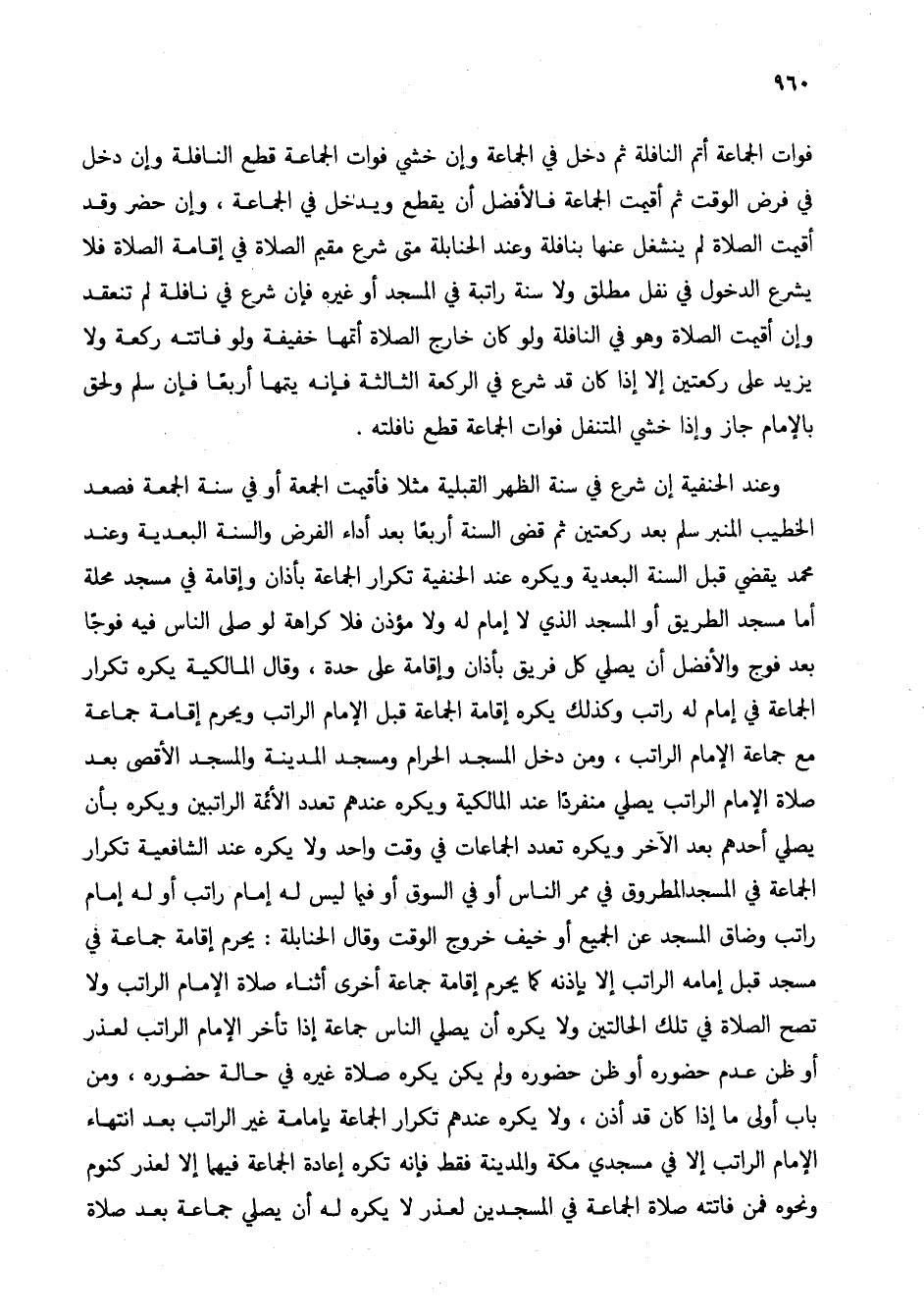 وعند الحنفية إن شرع في سنة الظهر القبلية مثلاً فأقيمت الجمعة أو في سنة الجمعة فصعد الخطيب المنبر سلم بعد ركعتين ثم قضى السنة أربعاً بعد أداء الفرض والسنة البعدية وعند محمد يقضي قبل السنة البعدية ويكره عند الحنفية تكرار الجماعة بأذان وإقامة في مسجد محلة أما مسجد الطريق أو المسجد الذي لا إمام له ولا مؤذن فلا كراهة لو صلى الناس فيه فوجاً بعد فوج والأفضل أن يصلي كل فريق بأذان وإقامة على حدة، وقال المالكية يكره تكرار الجماعة في إمام له راتب وكذلك يكره إقامة الجماعة قبل الإمام الراتب ويحرم إقامة جماعة مع جماعة الإمام الراتب، ومن دخل المسجد الحرام ومسجد المدينة والمسجد الأقصى بعد صلاة الإمام الراتب يصلي منفرداً عند المالكية ويكره عندهم تعدد الأئمة الراتبين ويكره بأن يصلي أحدهم بعد الآخر ويكره تعدد الجماعات في وقت واحد ولا يكره عند الشافعية تكرار الجماعة في المسجد المطروق في ممر الناس أو في السوق أو فيما ليس له إمام راتب أو له إما مراتب وضاق المسجد عن الجميع أو خيف خروج الوقت وقال الحنابلة: يحرم إقامة جماعة في مسجد قبل إمامه الراتب إلا بإذنه كما يحرم إقامة جماعة أخرى أثناء صلاة الإمام الراتب ولا تصح الصلاة في تلك الحالتين ولا يكره أن يصلي الناس جماعة إذا تأخر الإمام الراتب لعذر أو ظن عدم حضوره أو ظن حضوره ولم يكن يكره صلاة غيره في حالة حضوره، ومن باب أولى ما إذا كان قد أذن، ولا يكره عندهم تكرار الجماعة بإمامة غير الراتب بعد انتهاء الإمام الراتب إلا في مسجدي مكة والمدينة فقط فإنه تكره إعادة الجماعة فيهما إلا لعذر كنوم ونحوه فمن فاتته صلاة الجماعة في المسجدين لعذر لا يكره له أن يصلي جماعة بعد صلاة