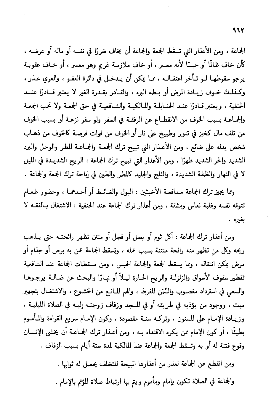 الجماعة، ومن الأعذار التي تسقط الجمعة والجماعة أن يخاف ضرراً في نفسه أو ماله أو عرضه، كأن خاف ظالماً أو حبساً لأنه معسر، أو خاف ملازمة غريم وهو معسر، أو خاف عقوبة يرجو سقوطها لو تأخر اعتقاله، مما يمكن أن يدخل في دائرة العفو، والعري عذر، وكذلك خوف زيادة المرض أو بطء البرء، والقادر بقدرة الغير لا يعتبر قادراً عند الحنفية، ويعتبر قادراً عند الحنابلة والمالكية والشافعية في حق الجمعة ولا تجب الجمعة والجماعة بسبب الخوف من الانقطاع عن الرفقة في السفر ولو سفر نزهة أو بسبب الخوف من تلف مال كخبز في تنور وطبيخ على نار أو الخوف من فوات فرصة كالخوف من ذهاب شخص يدله على ضائع، ومن الأعذار التي تبيح ترك الجمعة والجماعة المطر والوحل والبرد الشديد والحر الشديد ظهراً، ومن الأعذار التي تبيح ترك الجماعة: الريح الشديدة في الليل لا في النهار والظلمة الشديدة، والثلج والجليد كالمطر والطين في إباحة ترك الجمعة والجماعة.