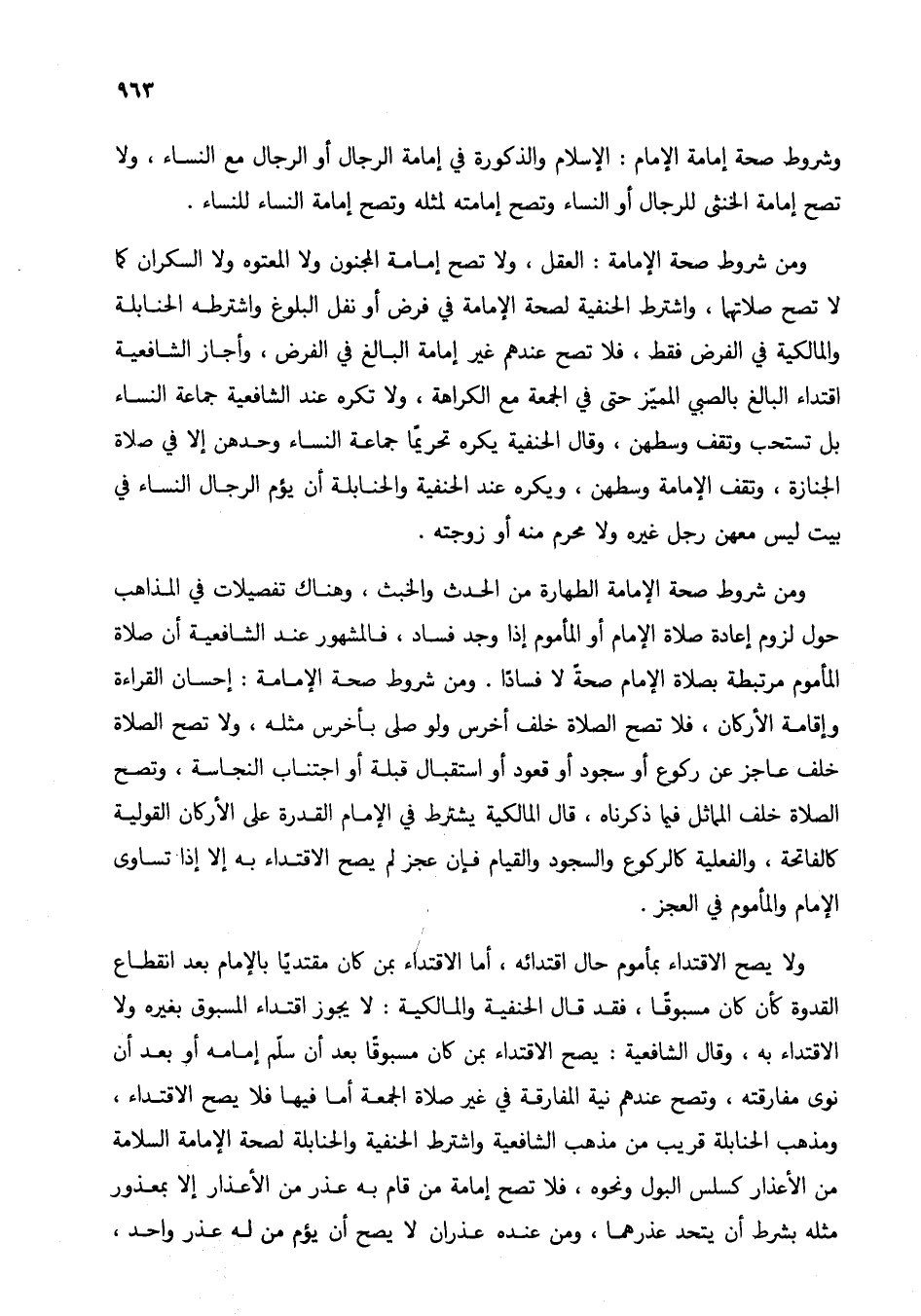 ومن شروط صحة الإمامة: العقل، ولا تصح إمامة المجنون ولا المعتوه ولا السكران كما لا تصح صلاتهما، واشترط الحنفية لصحة الإمامة في فرض أو نفل البلوغ واشترطه الحنابلة والمالكية في الفرض فقط، فلا تصح عندهم غير إمامة البالغ في الفرض، وأجاز الشافعية اقتداء البالغ بالصبي المميز حتى في الجمعة مع الكراهة، ولا تكره عند الشافعية جماعة النساء بل تستحب وتقف وسطهن، وقال الحنفية يكره تحريماً جماعة النساء وحدهن إلا في صلاة الجنازة، وتقف الإمامة وسطهن، ويكره عند الحنفية والحنابلة أن يؤم الرجال النساء في بيت ليس معهن رجل غيره ولا محرم منه أو زوجته.
