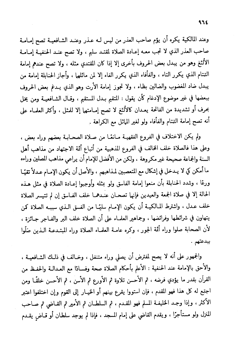 وعند المالكية يكره أن يؤم صاحب العذر من ليس له عذر وعند الشافعية تصح إمامة صاحب العذر الذي لا تجب معه إعادة الصلاة لمقتد سليم، ولا تصح عند الحنفية إمامة الألثغ وهو من يبدل بعض الحروف بأخرى إلا إذا كان المقتدي مثله، ولا تصح عندهم إمامة التمتام الذي يكرر التاء، والفأفاء الذي يكرر الفاء إلا لمن ماثلهما، وأجاز الحنابلة إمامة من يبدل ضاد المغضوب والضالين بظاء، ولا تجوز إمامة الأرت وهو الذي يدغم بعض الحروف ببعضها في غير موضوع الإدغام كأن يقول: المتقيم بدل المستقيم، وقال الشافعية ومن يخل بحرف أو تشديدة من الفاتحة يعدان كالألثغ لا تصح إمامتهما إلا للمثل، وأكثر العلماء على أنه تصح إمامة التمتام والفأفاء ولو لغير المماثل مع الكراهة.