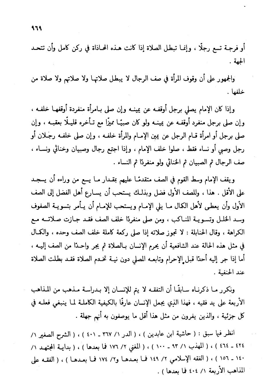وإذا كان الإمام يصلي برجل أوقفه عن يمينه وإن صلى بامرأة منفردة أوقفها خلفه، وإن صلى برجل منفرد أوقفه عن يمينه ولو كان صبياً مميزاً مع تأخره قليلاً بعقبه، وإن صلى برجل أو امرأة قام الرجل عن يمين الإمام والمرأة خلفه، وإن صلى خلفه رجلان أو رجل وصبي أو نساء فقط، صلوا خلف الإمام، وإذا اجتمع رجال وصبيان وخناثي ونساء، صف الرجال ثم الصبيان ثم الخناثي ولو منفرداً ثم النساء.