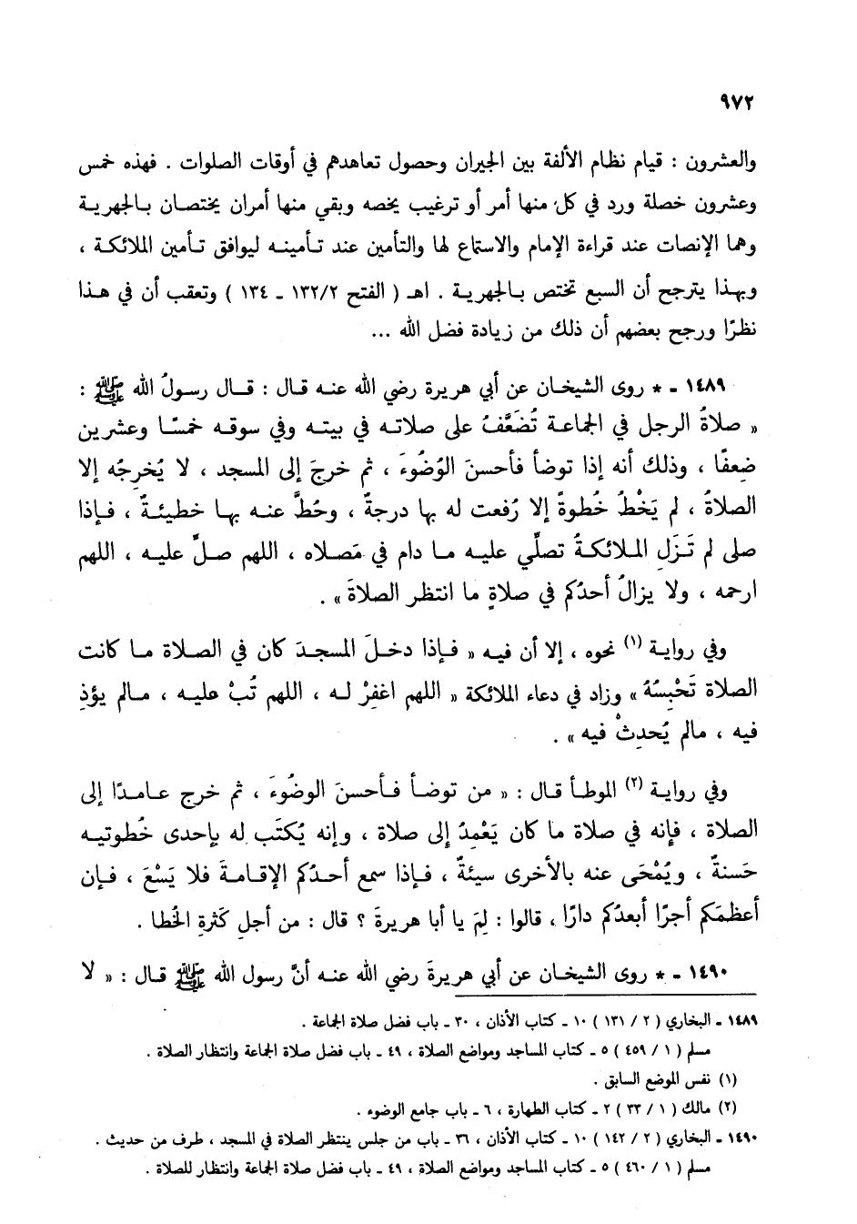 1489 - * روى الشيخان عن أبي هريرة رضي الله عنه قال: قال رسول الله صلى الله عليه وسلم: "صلاة الرجل في الجماعة تضعف على صلاته في بيته وفي سوقه خمساً وعشرين ضعفاً، وذلك أنه إذا توضأ فأحسن الوضوء، ثم خرج إلى المسجد، لا يخرجه إلا الصلاة، لم يخط خطوة إلا رفعت له بها درجة، وحط عنه بها خطيئة، فإذا صلى لم تزل الملائكة تصلي عليه ما دام في مصلاه، اللهم صل عليه، اللهم ارحمه، ولا يزال أحدكم في صلاة ما انتظر الصلاة".