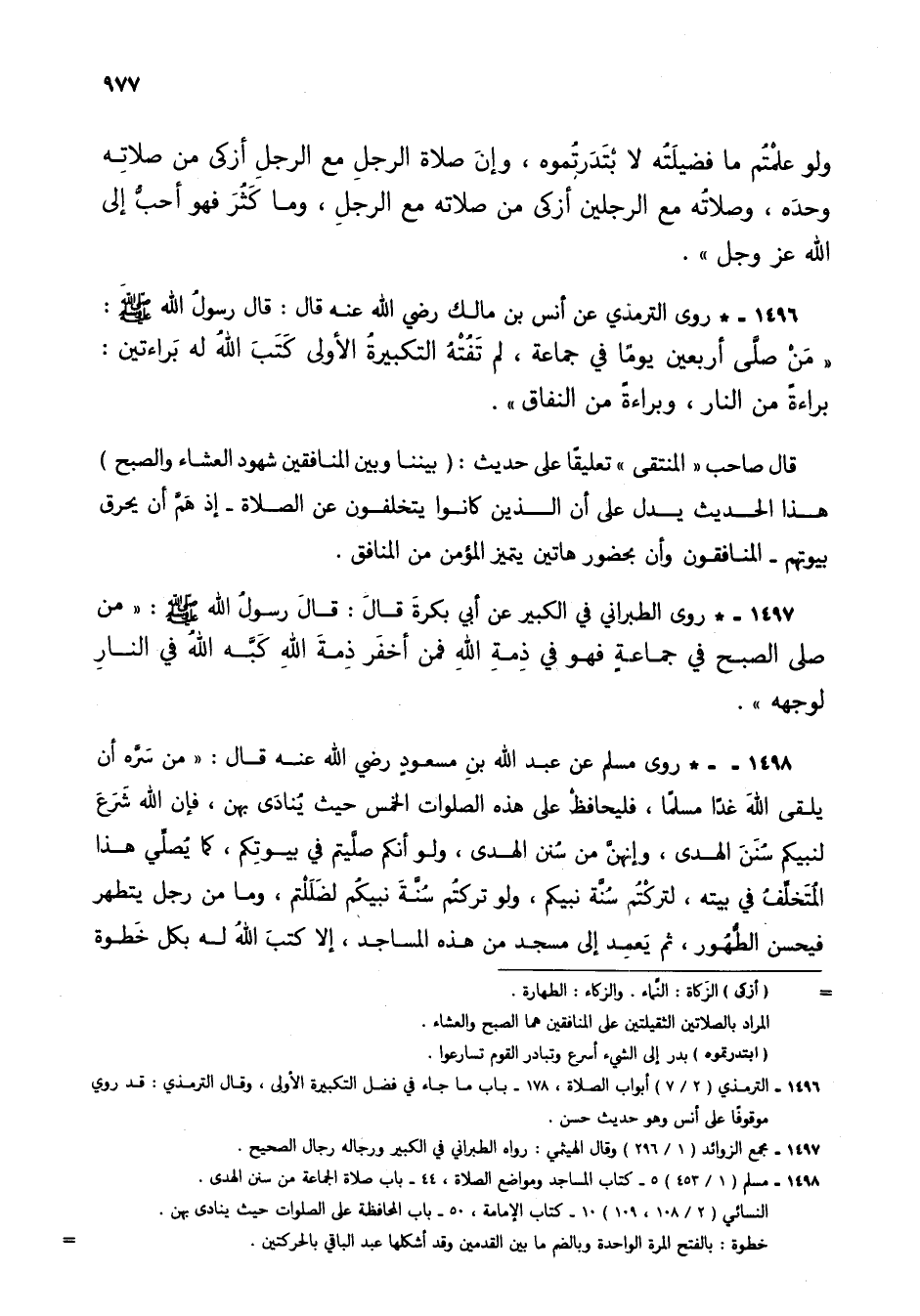 1498 - * روى مسلم عن عبد الله بن مسعود رضي الله عنه قال: "من سره أن يلقى الله غداً مسلماً، فليحافظ على هذه الصلوات الخمس حيث ينادى بهن، فإن الله شرع لنبيكم سنن الهدى، وإنهن من سنن الهدى، ولو أنكم صليتم في بيوتكم، كما يصلي هذا المتخلف في بيته، لتركتم سنة نبيكم، ولو تركتم سنة نبيكم لضللتم، وما من رجل يتطهر فيحسن الطهور، ثم يعمد إلى مسجد من هذه المساجد، إلا كتب الله له بكل خطوة