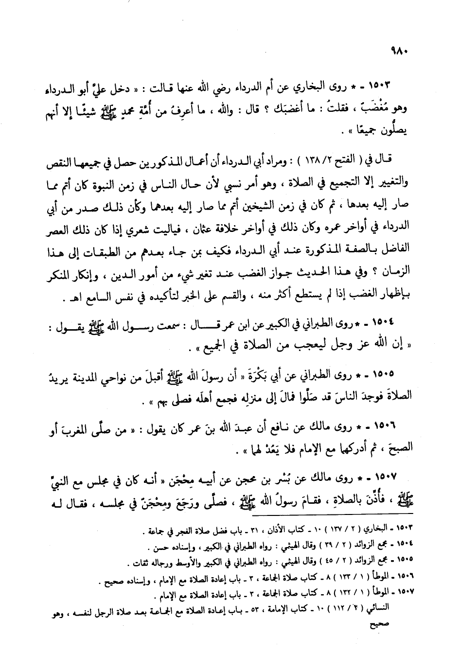 1503 - * روى البخاري عن أم الدرداء رضي الله عنها قالت: "دخل علي أبو الدرداء وهو مغضب، فقلت: ما أغضبك؟ قال: والله، ما أعرف من أمة محمد صلى الله عليه وسلم شيئاً إلا أنهم يصلون جميعاً".