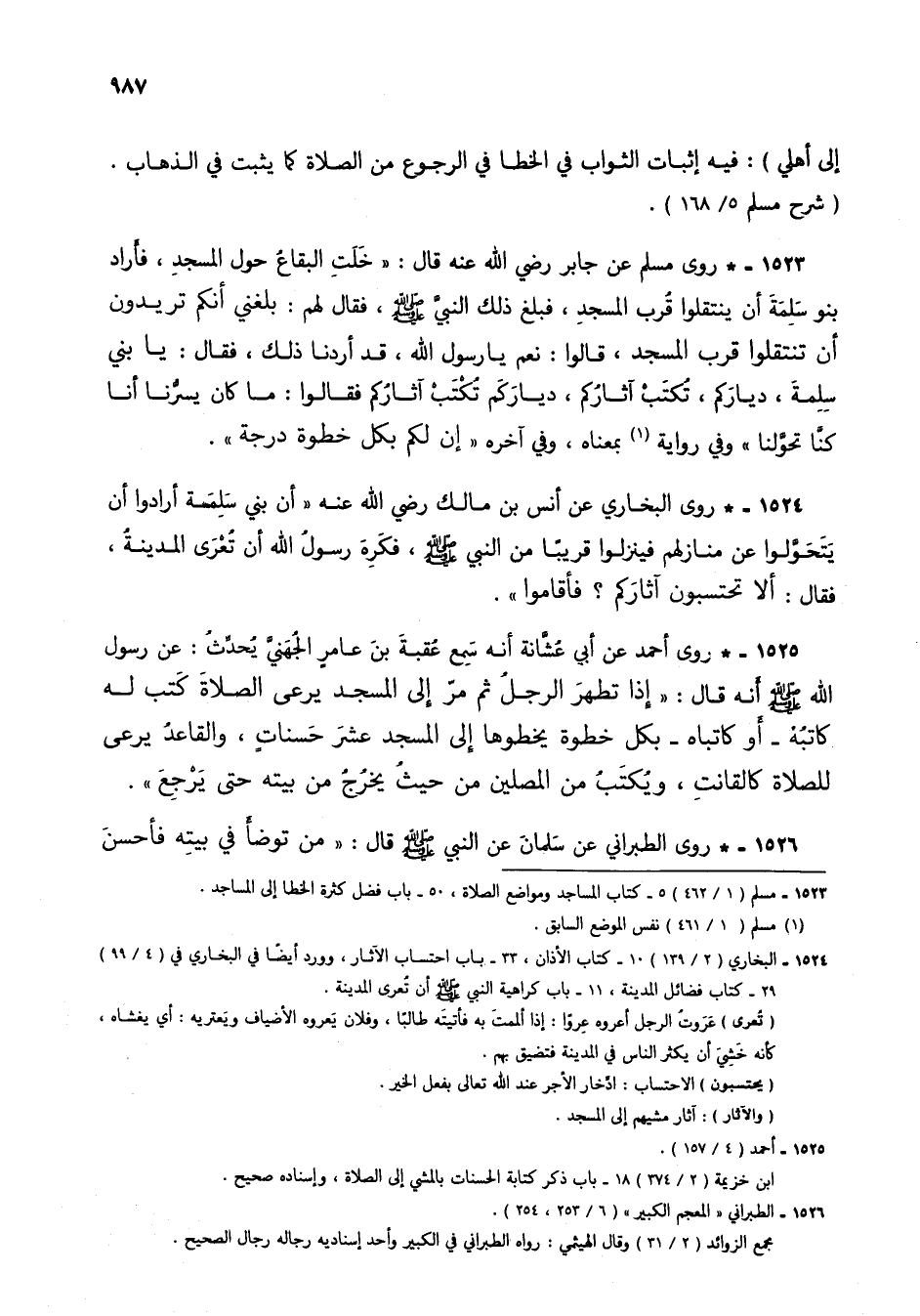 1523 - * روى مسلم عن جابر رضي الله عنه قال: "خلت البقاع حول المسجد، فأراد بنو سلمة أن ينتقلوا قرب المسجد، فبلغ ذلك النبي صلى الله عليه وسلم، فقال لهم: بلغني أنكم تريدون أن تنتقلوا قرب المسجد، قالوا: نعم يا رسول الله، قد أردنا ذلك، فقال: يا بني سلمة، دياركم، تكتب آثاركم، دياركم تكتب آثاركم فقالوا: ما كان يسرنا أنا كنا تحولنا" وفي رواية (2) بمعناه، وفي آخره "إن لكم بكل خطوة درجة".