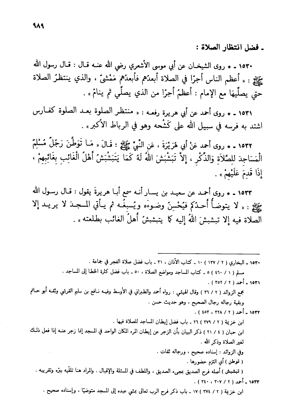 1531 - * روى أحمد عن أبي هريرة رفعه: "منتظر الصلوة بعد الصلوة كفارس اشتد به فرسه في سبيل الله على كشحه وهو في الرباط الأكبر".