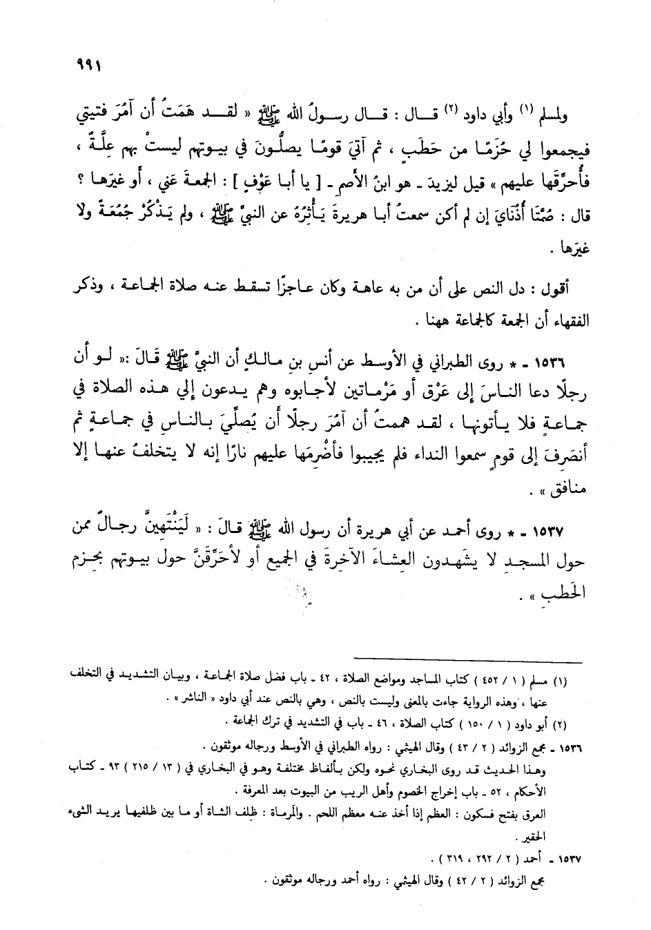 1537 - * روى أحمد عن أبي هريرة أن رسول الله صلى الله عليه وسلم قال: "لينتهين رجال ممن حول المسجد لا يشهدون العشاء الآخرة في الجميع أو لأحرقن حول بيوتهم بحزم الحطب".