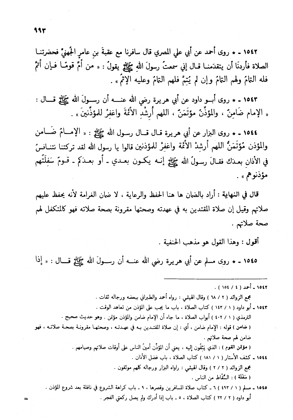 1542 - * روى أحمد عن أبي علي المصري قال سافرنا مع عقبة بن عامر الجهني فحضرتنا الصلاة فأردنا أن يتقدمنا قال إني سمعت رسول الله صلى الله عليه وسلم يقول: "من أم قوماً فإن أتم فله التمام ولهم التمام وإن لم يتم فلهم التمام وعليه الإثم".