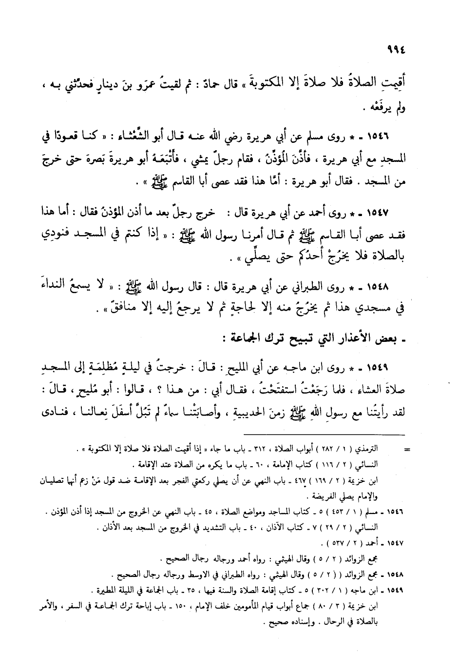 1546 - * روى مسلم عن أبي هريرة رضي الله عنه قال أبو الشعثاء: "كنا قعوداً في المسجد مع أبي هريرة، فأذن المؤذن، فقام رجل يمشي، فأتبعه أبو هريرة بصره حتى خرج من المسجد. فقال أبو هريرة: أما هذا فقد عصى أبا القاسم صلى الله عليه وسلم".