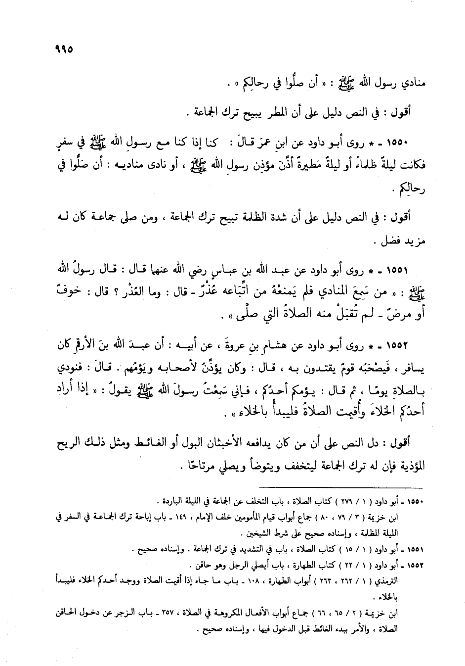 1550 - * روى أبو داود عن ابن عمر قال: كنا إذا كنا مع رسول الله صلى الله عليه وسلم في سفر فكانت ليلة ظلماء أو ليلة مطيرة أذن مؤذن رسول الله صلى الله عليه وسلم، أو نادى مناديه: أن صلوا في رحالكم.